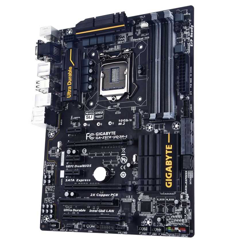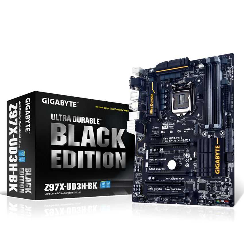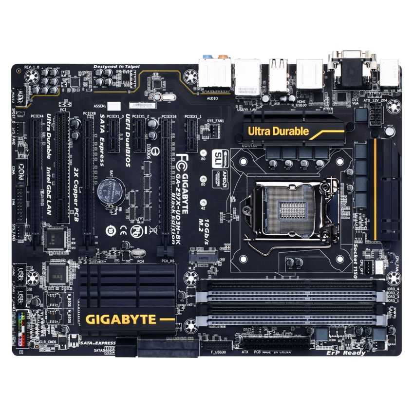Descripción Gigabyte GA-Z97X-UD3H-BK. tipos de memoria compatibles: DDR3-SDRAM, Tipo de ranuras de memoria: DIMM, Soporte de canales de memoria: Dual. Familia de procesador: Intel, Procesador compatible: Celeron, Core i3, Core i5, Core i7, Pentium, Socket de procesador: Socket H3 (LGA 1150). Interfaces de unidad de disco duro soportadas: Serial ATA III. Versión HDMI: 1.4a. Tipo de interfaz ethernet: Gigabit