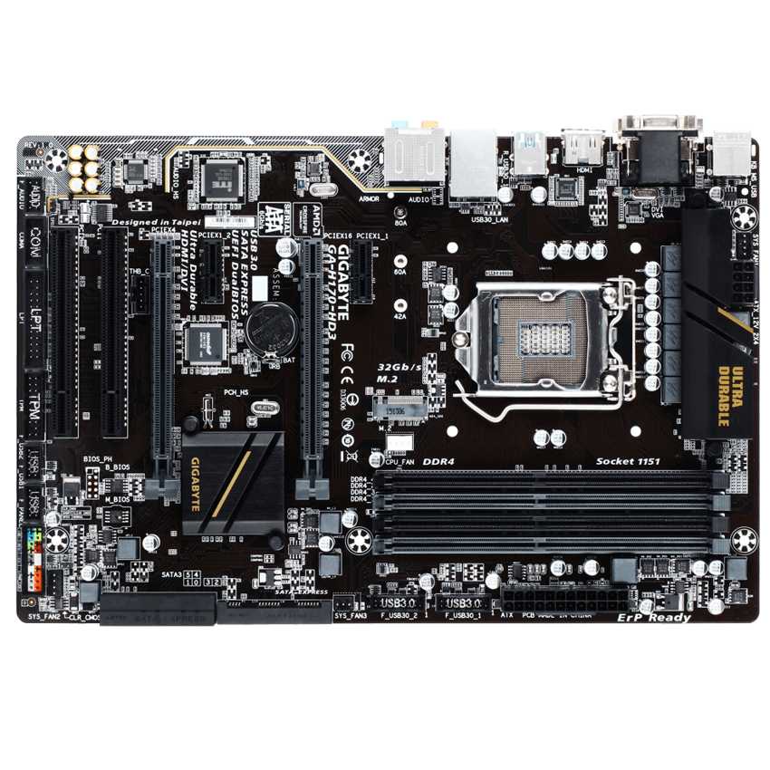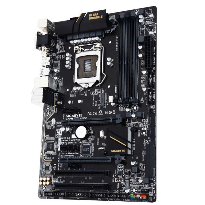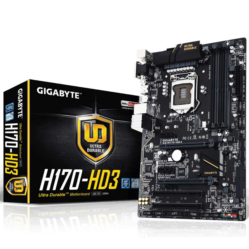 Descripción Gigabyte GA-H170-HD3. tipos de memoria compatibles: DDR4-SDRAM, Tipo de ranuras de memoria: DIMM, Canales de memoria: Dual. Familia de procesador: Intel, Procesador compatible: Celeron, Core i3, Core i5, Core i7, Pentium, Socket de procesador: LGA1151. Interfaces de unidad de disco duro soportadas: M.2, SATA. Tipo de interfaz ethernet: Gigabit. Componente para: PC, Familia de componentes de tarjeta madre: Intel, Circuito integrado de tarjeta madre: Intel H170