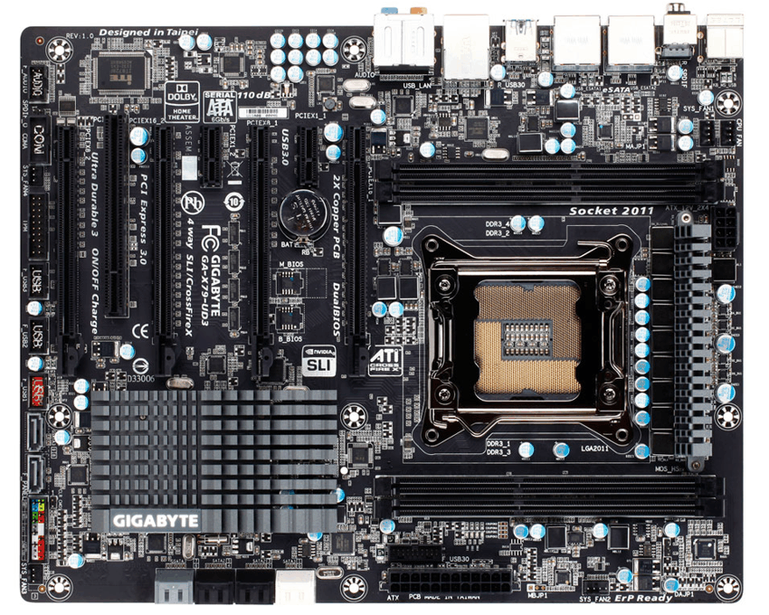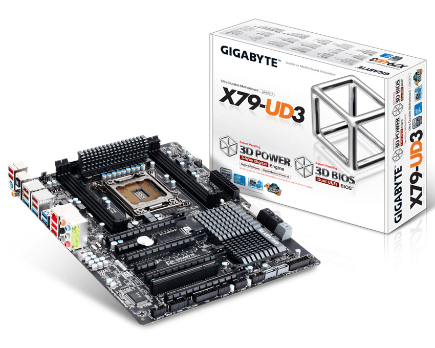 GA-X79-UD3, LGA2011, Intel X79, 4 x DDR3 2133MHz, 3 x PCIe3.0 x16 (4-Way/3-Way/2-Way AMD CrossFireX/NVIDIA SLI), 4 x SATA 3.0Gb/s, 6 x SATA 6.0Gb/s, 3D BIOS, ATX - Procesadores Intel LGA 2011® Core? i7 de Alto Rendimiento. - Arquitectura de Memoria con 4 Canales. - Soporte para PCI Express Gen. 3. - Nuevo Control de Energía Digital para el CPU y la Memoria. - Tecnología UEFI DualBIOS. - VRM con 8 fases overclockeable diseñadas con Capacitores Sólidos Japoneses y PowerPAK MOSFETs. - 333 Aceleración Integrada con USB 3.0, SATA 3.0 y 3x USB power boost. - Tecnología única On/Off charge. - Tecnología Ultra Durable? 3 de GIGABYTE. - Soporta Dolby Home Theater. - Audio en HD con 110dB SNR.