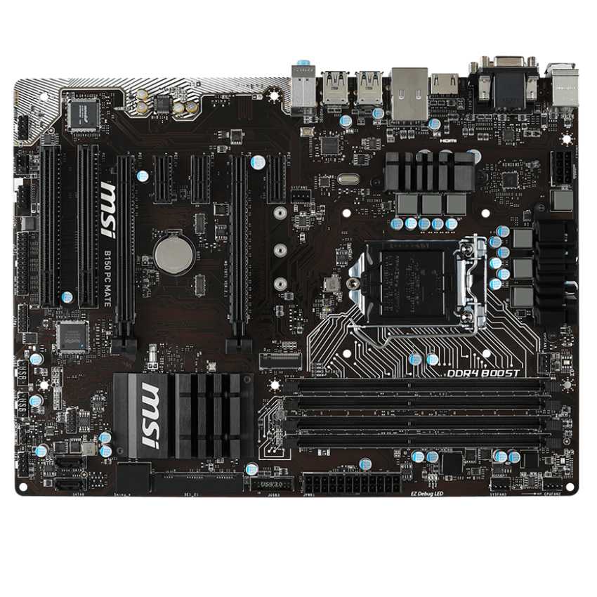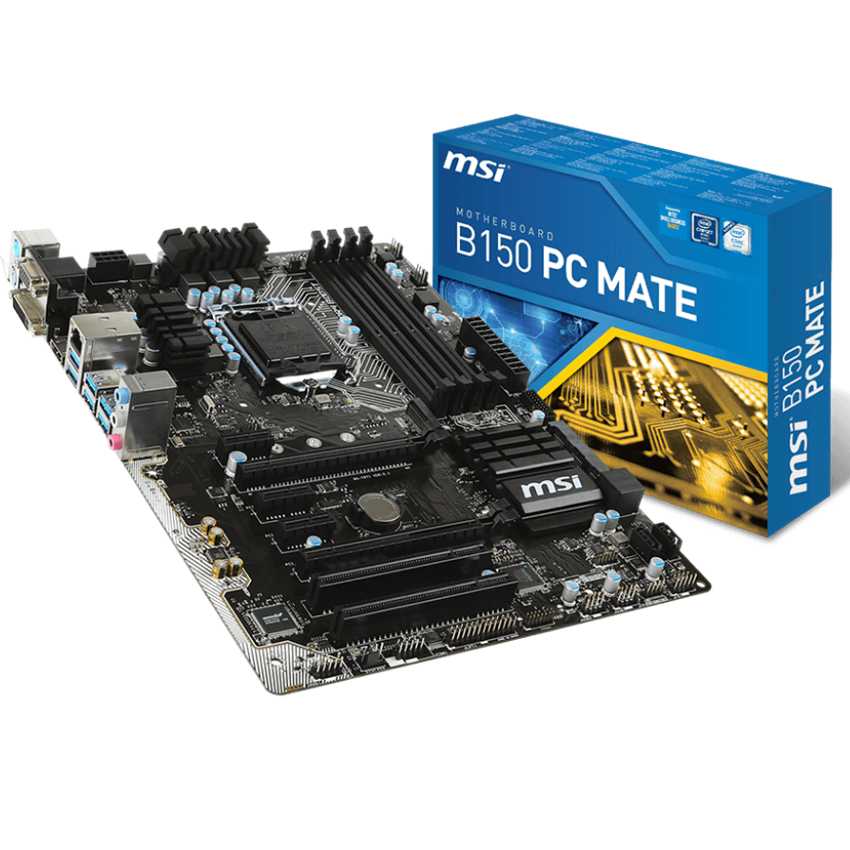 Descripción MSI B150 PC Mate. tipos de memoria compatibles: DDR4-SDRAM, Tipo de ranuras de memoria: DIMM, Canales de memoria: Dual. Familia de procesador: Intel, Procesador compatible: Core i5, Core i7, Celeron, Pentium, Core i3. Interfaces de unidad de disco duro soportadas: Serial ATA III. Tipo de interfaz ethernet: Rápido, Gigabit. Componente para: PC, Familia de componentes de tarjeta madre: Intel, Tarjeta madre, factor de forma: ATX