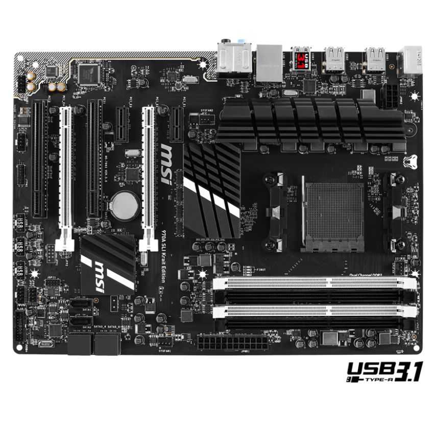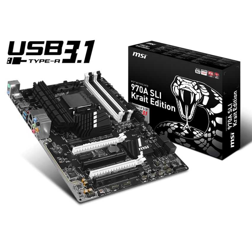 Descripción MSI 970A SLI KRAIT Edition. tipos de memoria compatibles: DDR3-SDRAM, Tipo de ranuras de memoria: DIMM, Canales de memoria: Dual. Familia de procesador: AMD, Procesador compatible: Athlon FX, Athlon II, Phenom FX, Sempron, Socket de procesador: Socket AM3+. Interfaces de unidad de disco duro soportadas: Serial ATA III. Controlador LAN: Realtek RTL8111E, Tipo de interfaz ethernet: Gigabit. Componente para: PC, Familia de componentes de tarjeta madre: AMD, Circuito integrado de tarjeta madre: AMD 970
