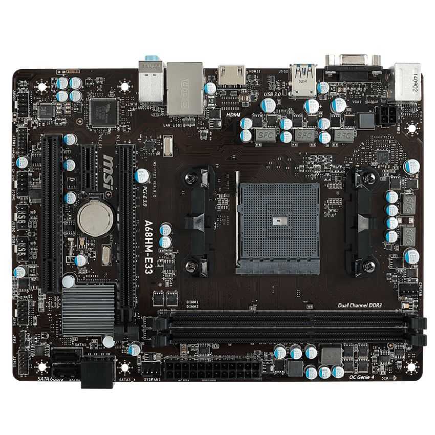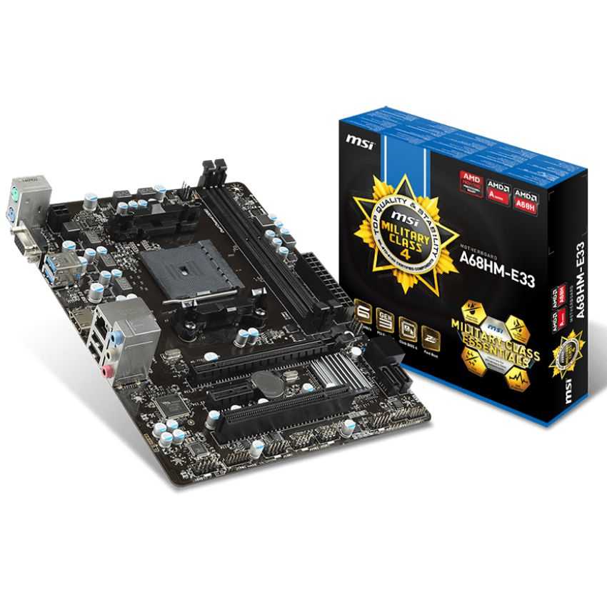 Descripción MSI A68HM-E33. tipos de memoria compatibles: DDR3-SDRAM, Tipo de ranuras de memoria: DIMM, Canales de memoria: Dual. Familia de procesador: AMD, Procesador compatible: AMD A, Athlon, Socket de procesador: Socket FM2+. Interfaces de unidad de disco duro soportadas: Serial ATA III. Controlador LAN: Realtek 8111G, Tipo de interfaz ethernet: Gigabit. Componente para: PC, Familia de componentes de tarjeta madre: AMD, Circuito integrado de tarjeta madre: AMD A68H