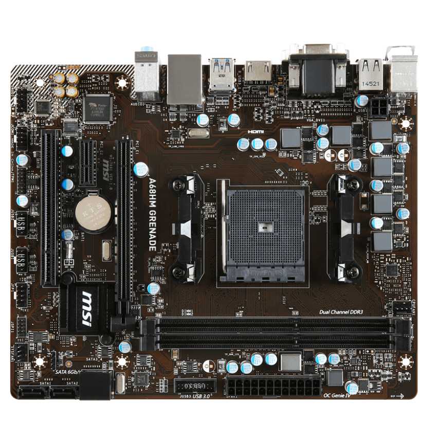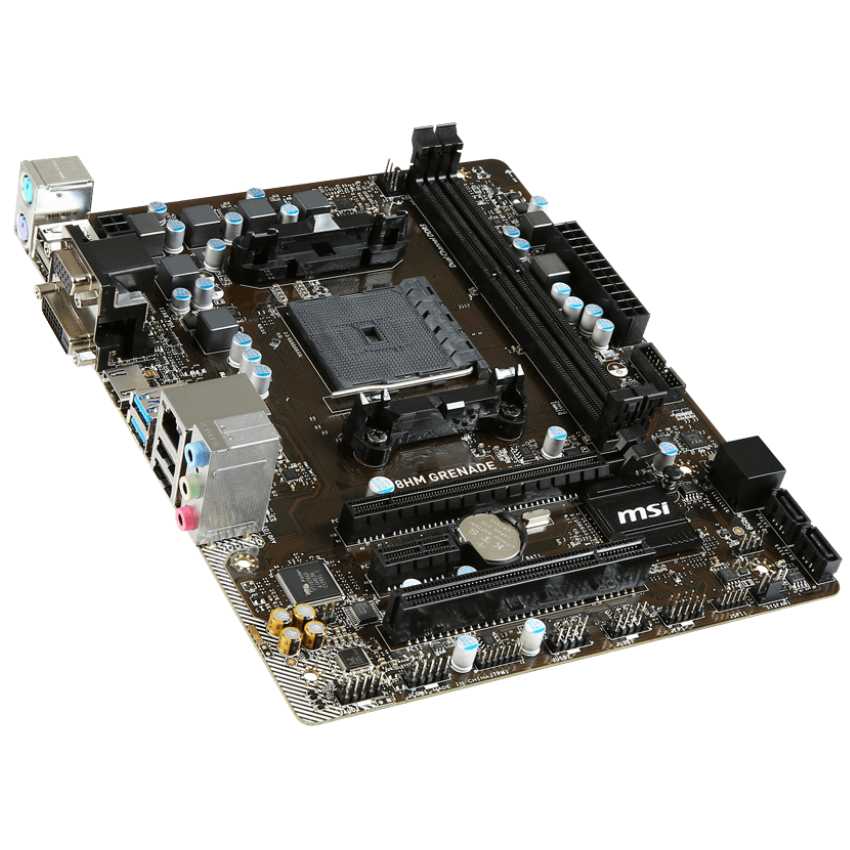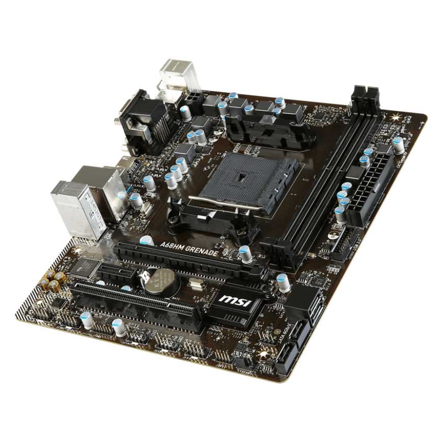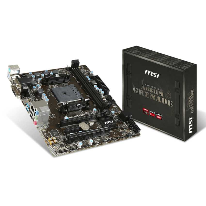 Descripción MSI A68HM GRENADE. tipos de memoria compatibles: DDR3-SDRAM, Tipo de ranuras de memoria: DIMM, Canales de memoria: Dual. Familia de procesador: AMD, Procesador compatible: AMD A, Athlon, Socket de procesador: Socket FM2+. Interfaces de unidad de disco duro soportadas: Serial ATA III. Controlador LAN: Realtek RTL8111G, Tipo de interfaz ethernet: Gigabit. Componente para: Mini PC, Familia de componentes de tarjeta madre: AMD, Circuito integrado de tarjeta madre: AMD A68H