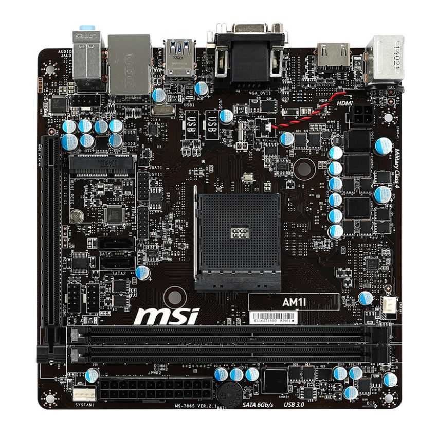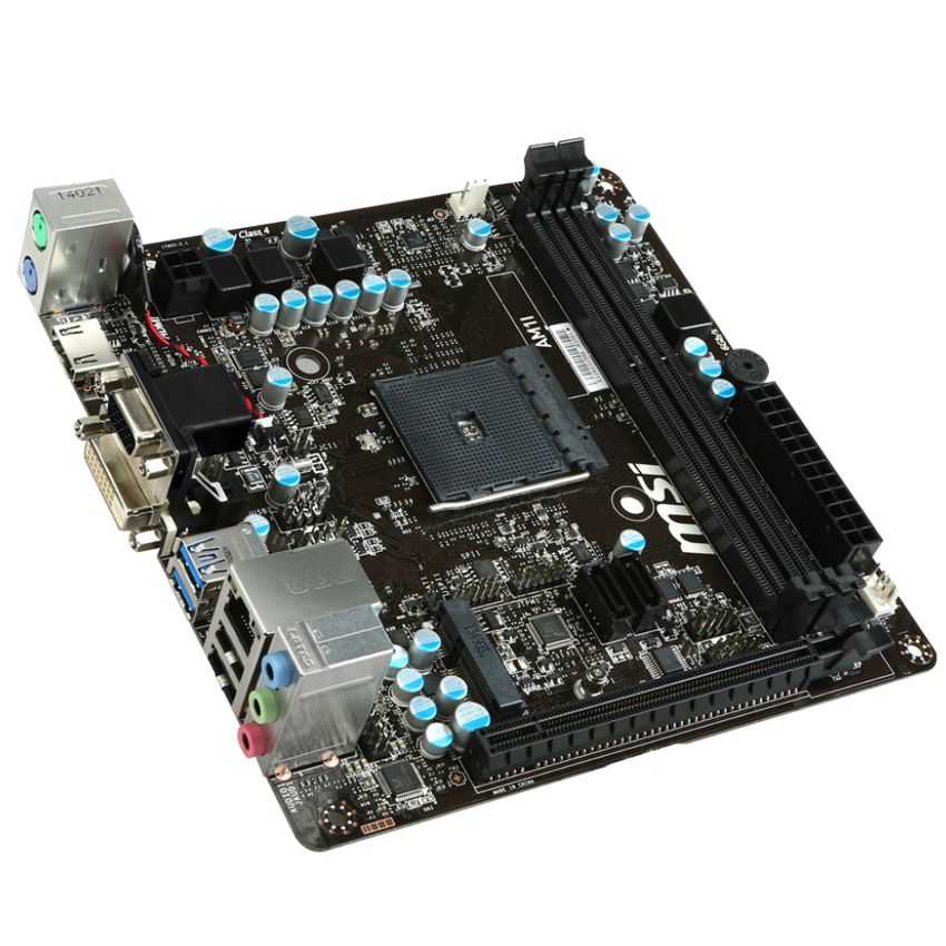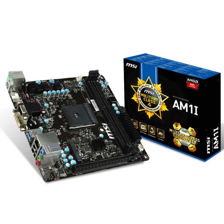 Descripción MSI AM1I. tipos de memoria compatibles: DDR3-SDRAM, Tipo de ranuras de memoria: DIMM, Canales de memoria: Solo. Familia de procesador: AMD, Procesador compatible: Athlon, Sempron, Socket de procesador: Socket AM1. Interfaces de unidad de disco duro soportadas: Serial ATA III. Controlador LAN: Realtek RTL8111G, Tipo de interfaz ethernet: Gigabit. Componente para: PC, Familia de componentes de tarjeta madre: AMD, Tarjeta madre, factor de forma: Mini iTX