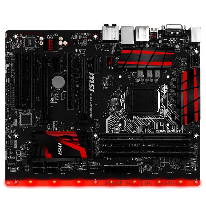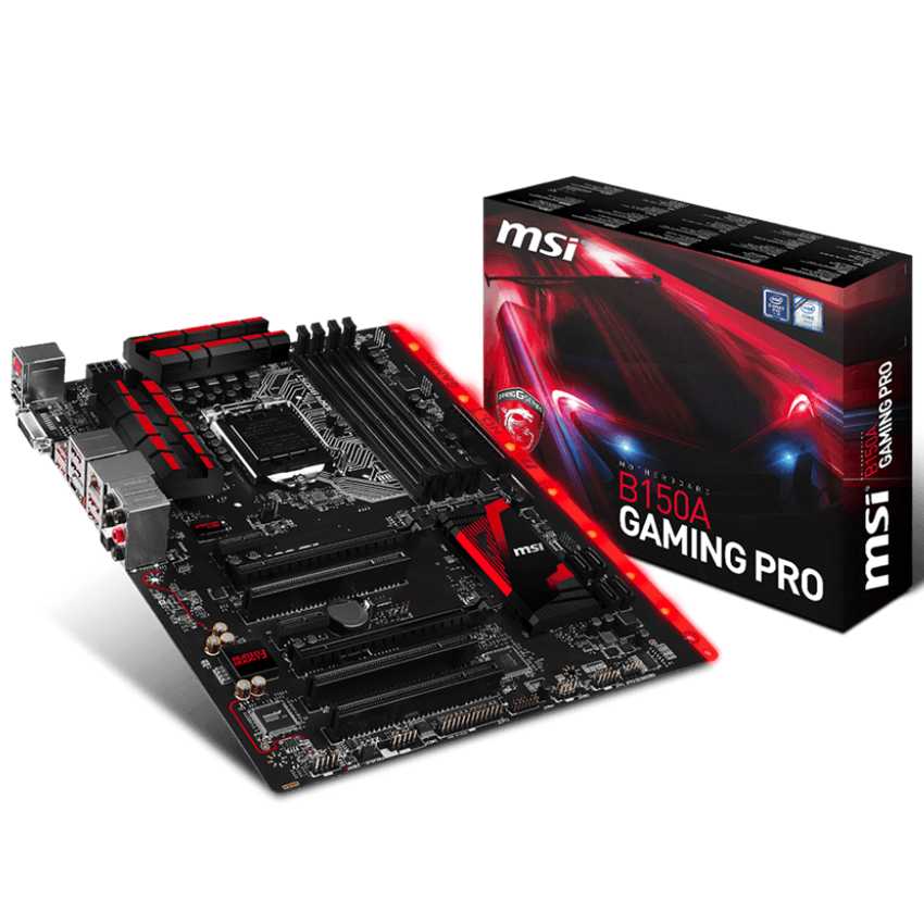 Descripción MSI B150A Gaming Pro. tipos de memoria compatibles: DDR4-SDRAM, Tipo de ranuras de memoria: DIMM, Canales de memoria: Dual. Familia de procesador: Intel, Procesador compatible: Core i5, Core i7, Celeron, Pentium, Core i3. Interfaces de unidad de disco duro soportadas: Serial ATA III. Controlador LAN: Intel I219-V, Tipo de interfaz ethernet: Rápido, Gigabit. Componente para: PC, Familia de componentes de tarjeta madre: Intel, Tarjeta madre, factor de forma: ATX