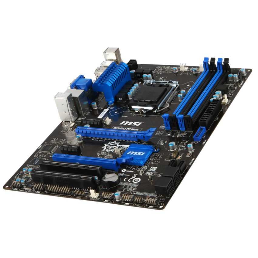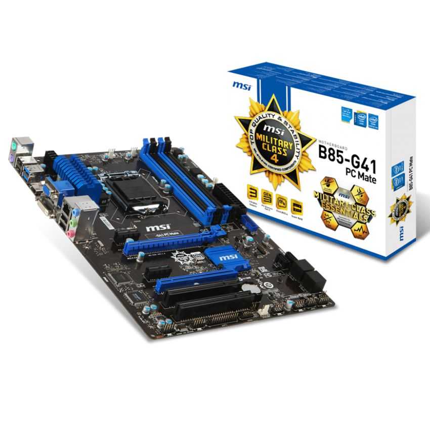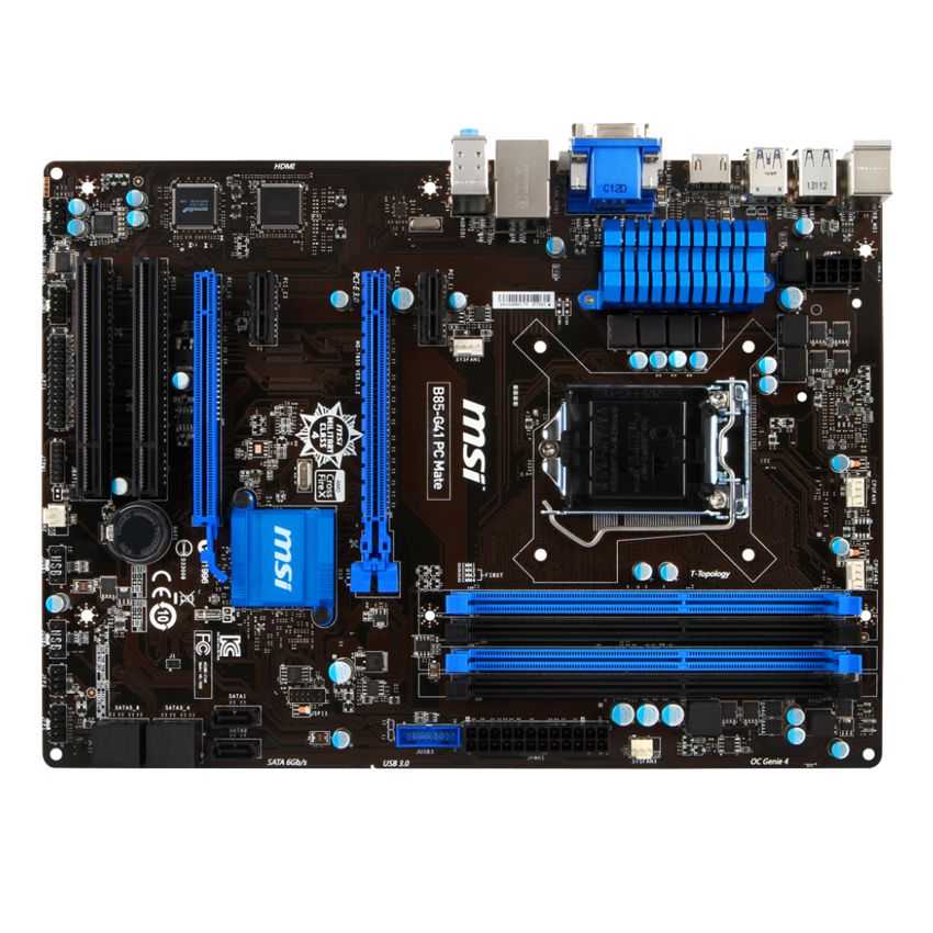 Descripción MSI B85-G41 PC Mate. tipos de memoria compatibles: DDR3-SDRAM, Tipo de ranuras de memoria: DIMM, Canales de memoria: Dual. Familia de procesador: Intel, Procesador compatible: Celeron, Core i3, Core i5, Core i7, Pentium, Socket de procesador: Socket H3 (LGA 1150). Interfaces de unidad de disco duro soportadas: Serial ATA II, Serial ATA III. Controlador LAN: Realtek RTL8111G, Tipo de interfaz ethernet: Gigabit. Componente para: PC, Familia de componentes de tarjeta madre: Intel, Circuito integrado de tarjeta madre: Intel B85