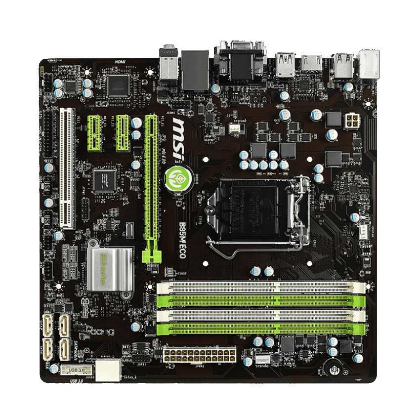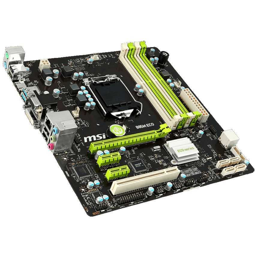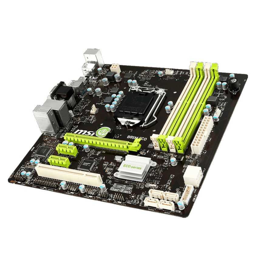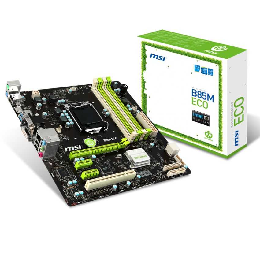 Especificaciones Características: ? TÜV CERTIFIED o Todas las placas base MSI ECO de la serie han pasado numerosas pruebas TÜV y finalmente recibió los certificados TÜV para la eficiencia energética y la estabilidad a largo plazo. Desde hace mucho tiempo TÜV es una empresa independiente muy reconocida en el sector y otorga al diseño ECO exclusivo de MSI como el más eficiente y destaca un aumento de la esperanza de vida para las placas base MSI de la serie ECO. Disfrute de un verdadero ahorro de energía durante mucho tiempo con las placas base MSI ECO Series. ? Hacer más con menos o Ahorra un 40% de energía, 100% rendimiento y 100% compatible. Todo esto son los factores que definen perfectamente a la Serie ECO ? PCB optimizado o MSI utiliza técnicas únicas en el hardware y el software y han diseñado la Serie ECO ¡para utilizar menos energía que una bombilla! Ahorre hasta un 40%. ? Eco Centro Pro o 3 Presest de ahorro de energía o Con un solo click active el ahorro máximo o Controla el apagado y encendido de los ventiladores o Controla el apagado y encendido de las luces o Controla el apagado y encendido de los periféricos o Guardado de la configuración de la BIOS ? Botón ECO o Eficiencia a su control; pulsando el botón ECO se activa al inmediatamente.Facilidad de uso con un botón en hardware, BIOS y software. Diseñado para escoger la configuración que desees ? Totalmente compatible o Soporta todas las CPUs como cualquier otra placa base o Optimizado para Intel S y T de energía CPUs eficientes o Soporta toda la memoria DDR3 Especificaciones: ? Factor de forma M-ATX ? CPU (Max Soportado) i7 ? FSB / Hyper Transport Bus 100MHz ? Chipset Intel ® B85 express ? Memoria DDR3 DDR3 1066/1333/1600 MHz ? Canal de Memoria Dual ? 4 x DIMM Slots ? Max Memoria 32GB ? 1 x PCI-Ex16 ? PCI-E Gen Gen3 (16) ? 2 x PCI-EX1 ? 1 x PCI ? 2 x Puertos USB 3.0 (frontal) ? 4 x SATAIII ? 4 x Puertos USB 2.0 (frontal) ? 2 x SATAII ? 1 x LAN 10/100/1000 ? 1 x TPM ? 2 x Puertos USB 3.0 (Posterior) ? 4 x Puertos USB 2.0 (Posterior) ? 3 x Puerto Audio (Posterior) ? 1 x VGA ? 1 x HDMI ? 1 x DVI ? Memoria Compartida Max VGA (MB) 1024 ? DirectX DX11