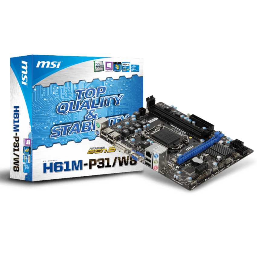 Descripción MSI H61M-P31/W8. tipos de memoria compatibles: DDR3-SDRAM, Tipo de ranuras de memoria: DIMM, Canales de memoria: Dual. Familia de procesador: Intel, Procesador compatible: Celeron G, Core i3, Core i5, Core i7, Pentium, Xeon, Socket de procesador: Socket H2 (LGA 1155). Interfaces de unidad de disco duro soportadas: Serial ATA II. Controlador LAN: Realtek RTL8111E, Tipo de interfaz ethernet: Gigabit. Componente para: PC, Familia de componentes de tarjeta madre: Intel, Circuito integrado de tarjeta madre: Intel H61