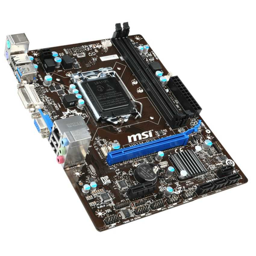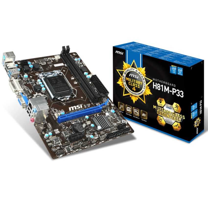 Descripción MSI H81M-P33. tipos de memoria compatibles: DDR3-SDRAM, Tipo de ranuras de memoria: DIMM, Soporte de canales de memoria: Dual. Familia de procesador: Intel, Procesador compatible: Celeron, Core i3, Core i5, Core i7, Pentium, Socket de procesador: Socket H3 (LGA 1150). Interfaces de unidad de disco duro soportadas: Serial ATA II, Serial ATA III. Controlador LAN: Realtek RTL8111G, Tipo de interfaz ethernet: Gigabit. Componente para: PC, Familia de componentes de tarjeta madre: Intel, Circuito integrado de tarjeta madre: Intel H81