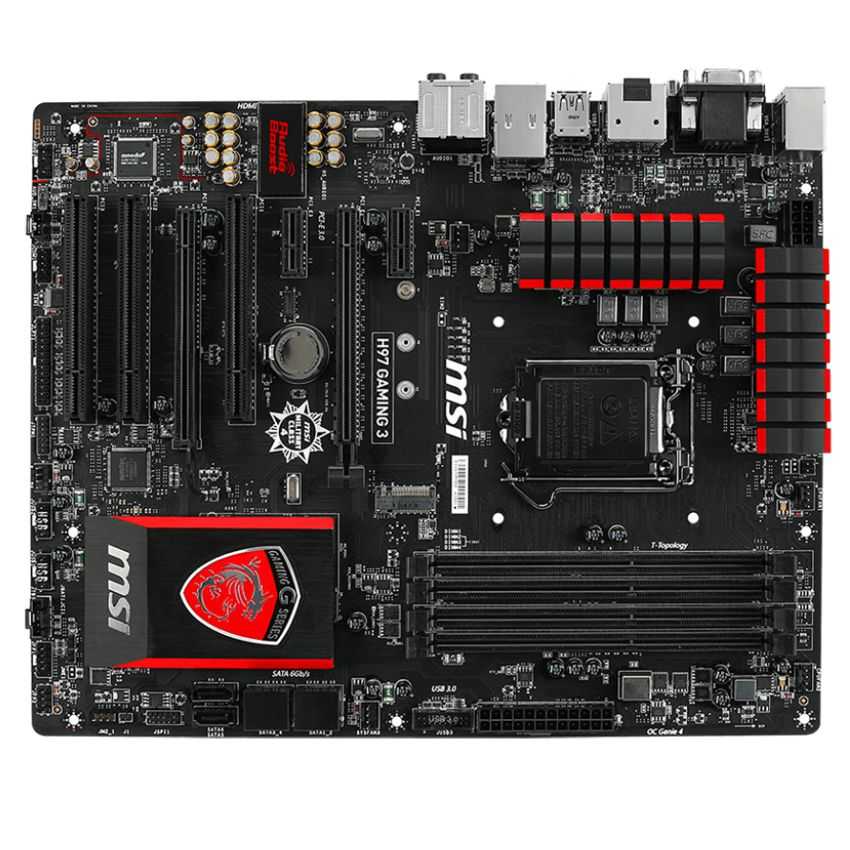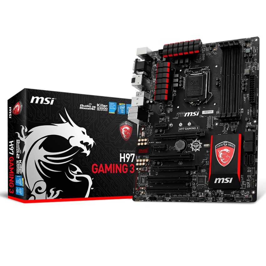 Descripción MSI H97 GAMING 3. tipos de memoria compatibles: DDR3-SDRAM, Tipo de ranuras de memoria: DIMM, Canales de memoria: Dual. Familia de procesador: Intel, Procesador compatible: Celeron, Pentium, Socket de procesador: Socket H3 (LGA 1150). Interfaces de unidad de disco duro soportadas: SATA. Tipo de interfaz ethernet: Gigabit. Componente para: PC, Familia de componentes de tarjeta madre: Intel, Circuito integrado de tarjeta madre: Intel H97
