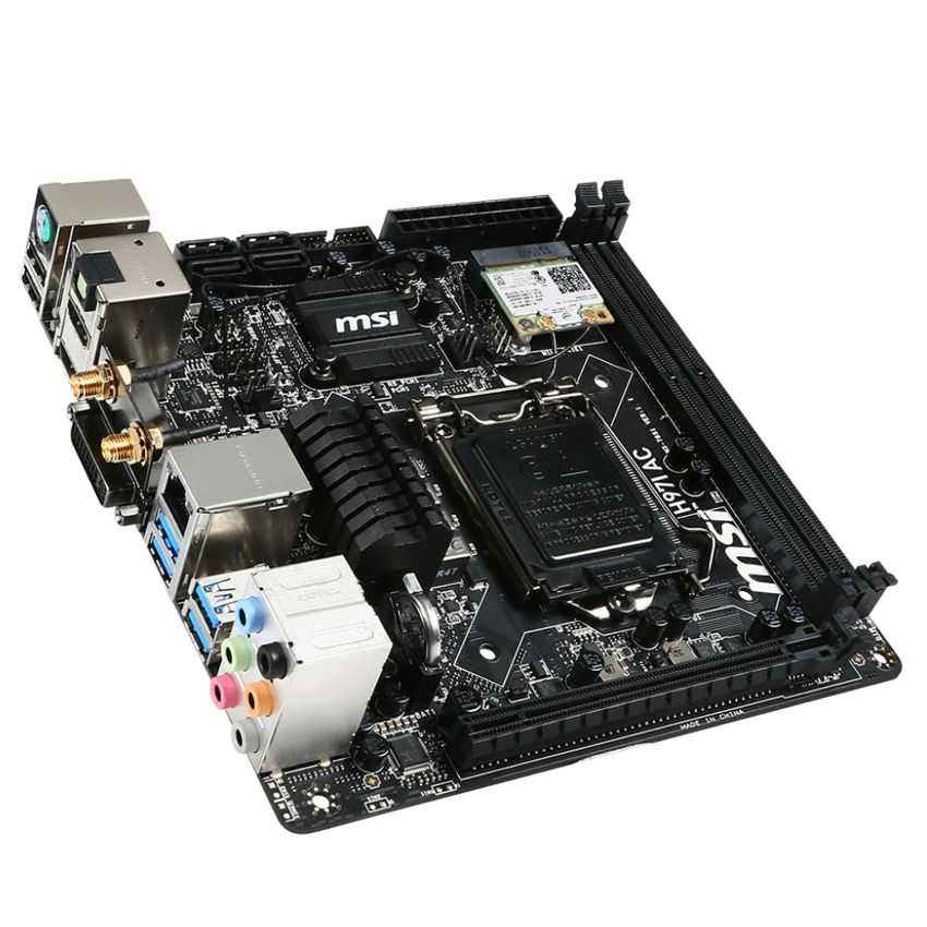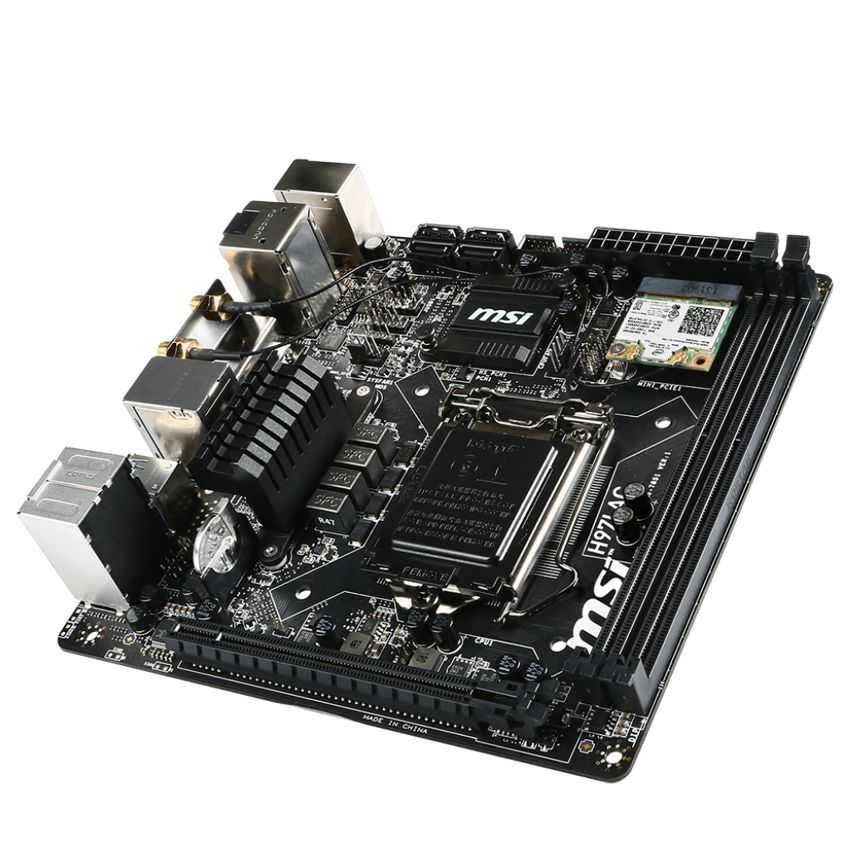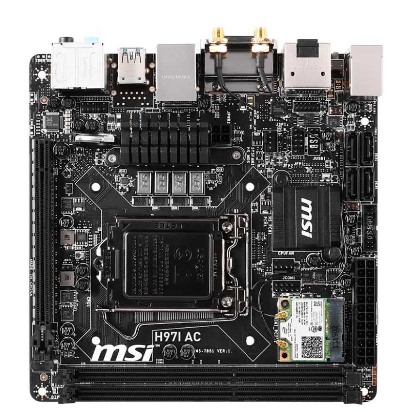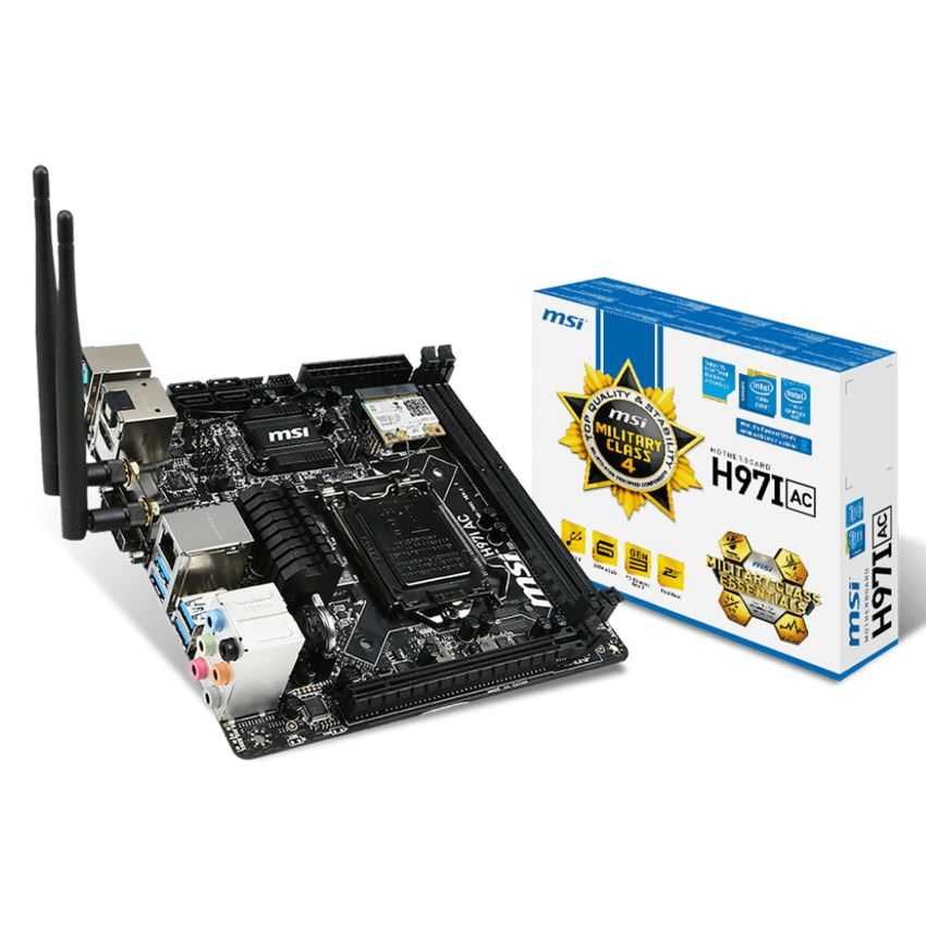 Descripción MSI H97I AC. tipos de memoria compatibles: DDR3-SDRAM, Tipo de ranuras de memoria: DIMM, Soporte de canales de memoria: Dual. Familia de procesador: Intel, Procesador compatible: Celeron, Pentium, Socket de procesador: Socket H3(1150). Interfaces de unidad de disco duro soportadas: Serial ATA III. Controlador LAN: Realtek 8111G, Tipo de interfaz ethernet: Gigabit. Componente para: PC, Familia de componentes de tarjeta madre: Intel, Circuito integrado de tarjeta madre: Intel H97