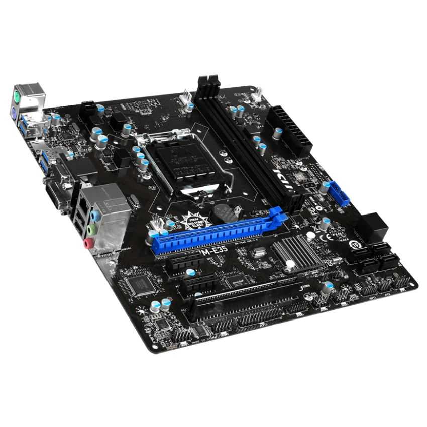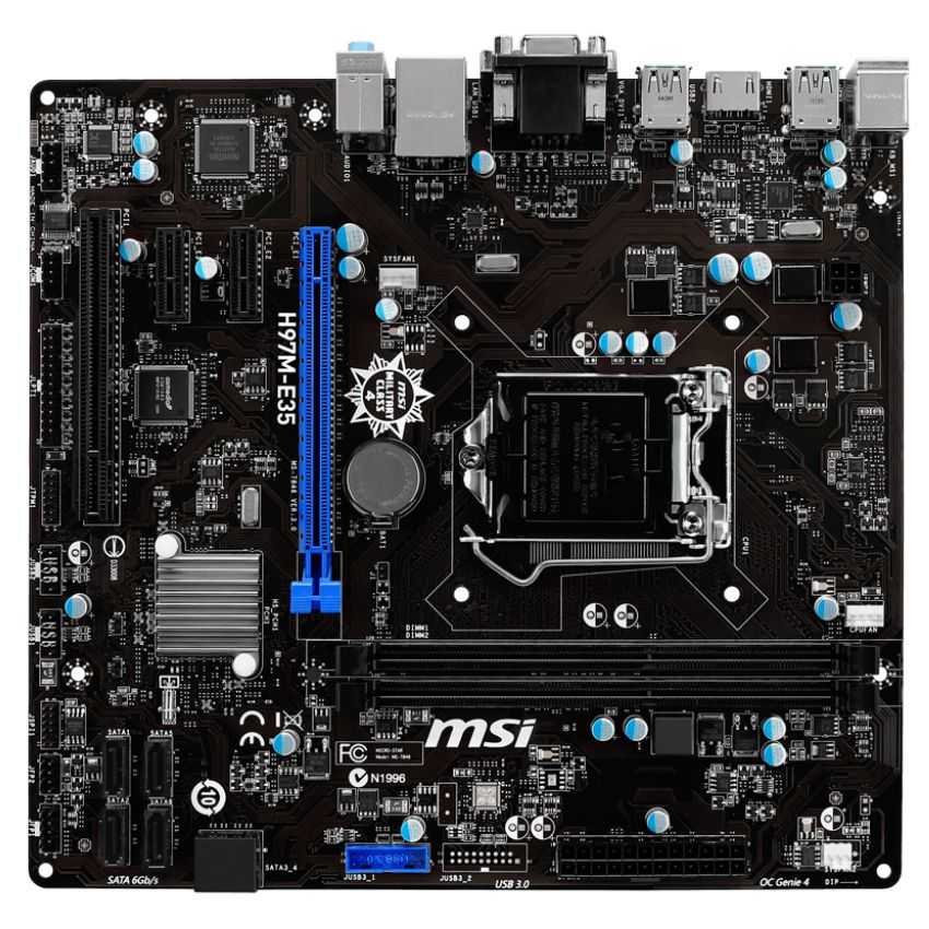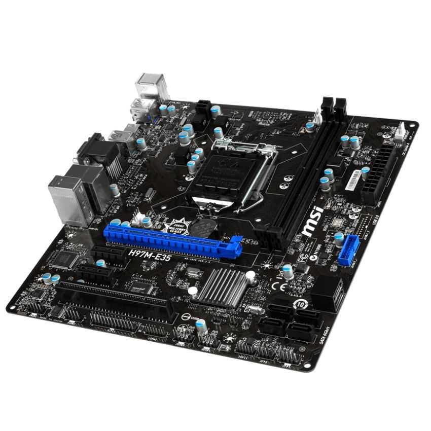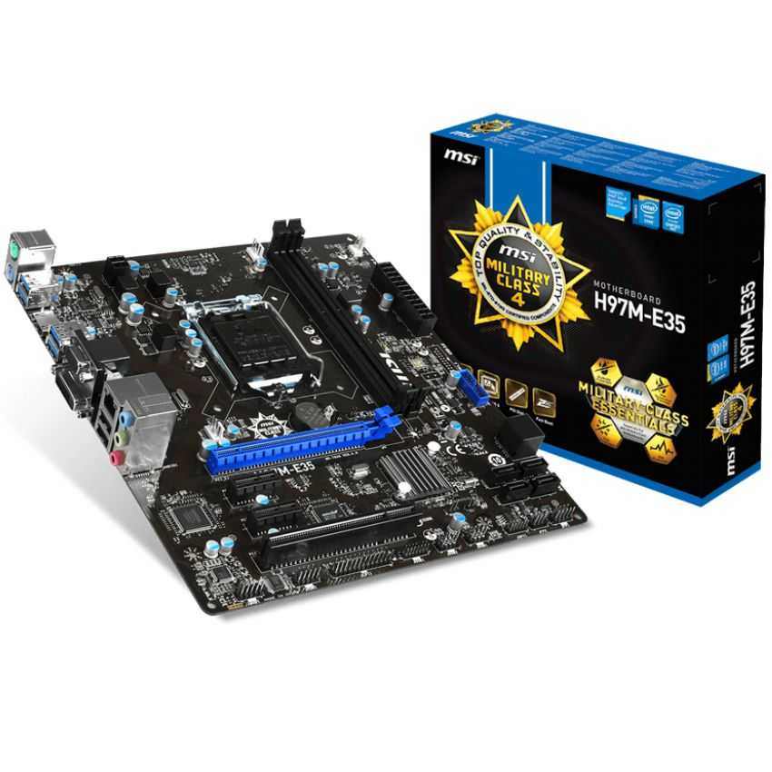Descripción MSI H97M-E35. tipos de memoria compatibles: DDR3-SDRAM, Tipo de ranuras de memoria: DIMM, Canales de memoria: Dual. Familia de procesador: Intel, Procesador compatible: Celeron, Pentium, Socket de procesador: Socket H3 (LGA 1150). Interfaces de unidad de disco duro soportadas: SATA. Controlador LAN: Realtek RTL8111G, Tipo de interfaz ethernet: Gigabit. Componente para: PC, Familia de componentes de tarjeta madre: Intel, Circuito integrado de tarjeta madre: Intel H97