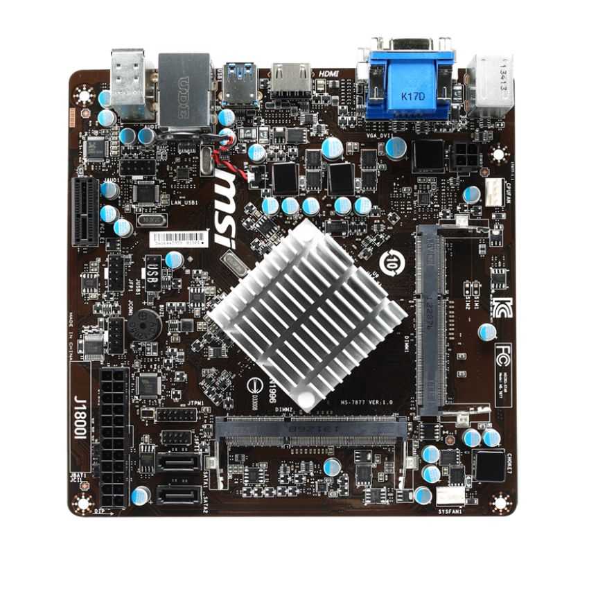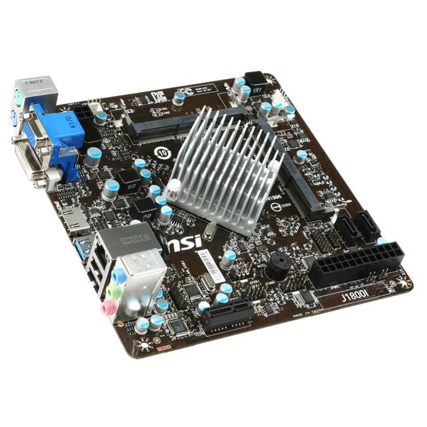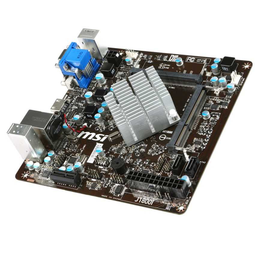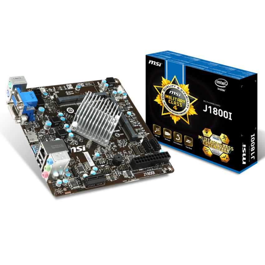 Descripción MSI J1800I. tipos de memoria compatibles: DDR3-SDRAM, Tipo de ranuras de memoria: SO-DIMM, Canales de memoria: Dual. Familia de procesador: Intel, Socket de procesador: NA (CPU integrada), Procesador incorporado: Celeron J1800. Interfaces de unidad de disco duro soportadas: Serial ATA II. Controlador LAN: Realtek RTL8111G, Tipo de interfaz ethernet: Gigabit. Familia de componentes de tarjeta madre: Intel, Tarjeta madre, factor de forma: Mini iTX, Sistema de audio: Realtek ALC887