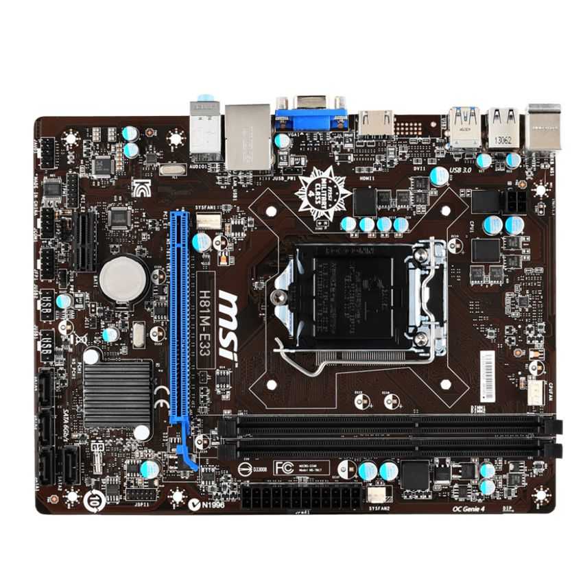 Descripción MSI H81M-E33. tipos de memoria compatibles: DDR3-SDRAM, Tipo de ranuras de memoria: DIMM, Canales de memoria: Dual. Familia de procesador: Intel, Procesador compatible: Celeron, Core i3, Core i5, Core i7, Pentium, Socket de procesador: Socket H3 (LGA 1150). Interfaces de unidad de disco duro soportadas: Serial ATA II, Serial ATA III. Controlador LAN: Realtek RTL8111G, Tipo de interfaz ethernet: Gigabit. Componente para: PC, Familia de componentes de tarjeta madre: Intel, Circuito integrado de tarjeta madre: Intel H81