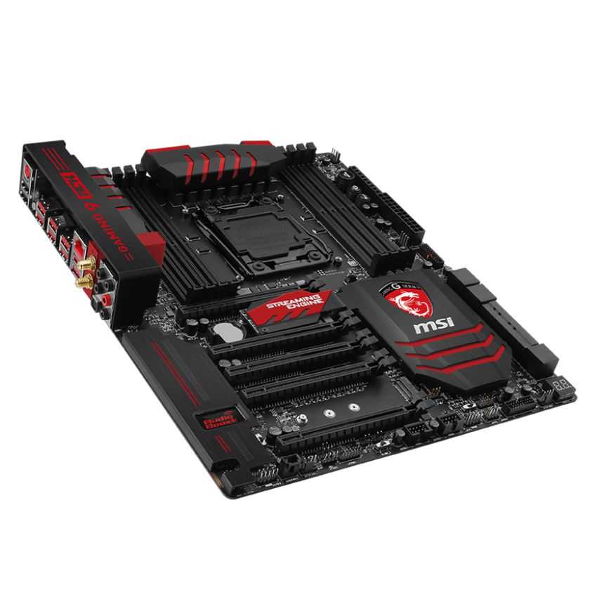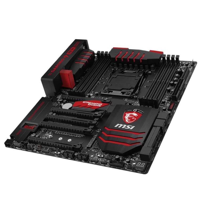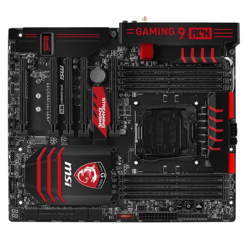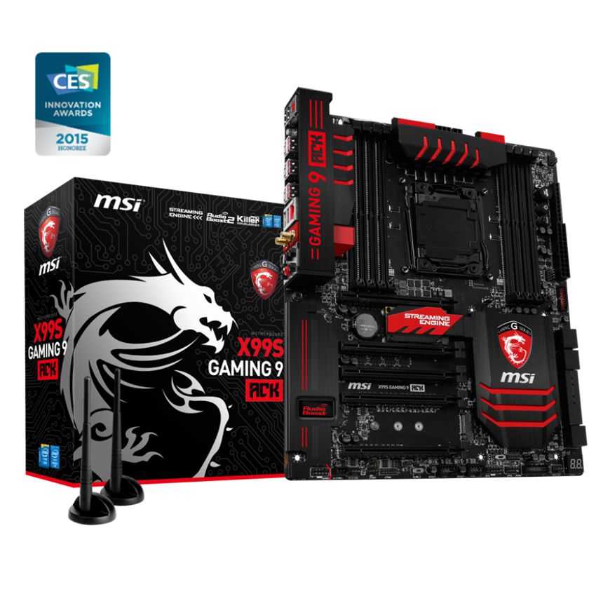 Descripción MSI X99S GAMING 9 ACK. tipos de memoria compatibles: DDR4-SDRAM, Tipo de ranuras de memoria: DIMM, Canales de memoria: Quad. Familia de procesador: Intel, Procesador compatible: Core i7 Extreme Edition, Socket de procesador: LGA 2011-v3. Interfaces de unidad de disco duro soportadas: SATA. Controlador LAN: Bigfoot Killer E2205, Tipo de interfaz ethernet: Gigabit, Wi-Fi estándars: 802.11a, 802.11ac, 802.11b, 802.11g, 802.11n. Componente para: PC, Familia de componentes de tarjeta madre: Intel, Circuito integrado de tarjeta madre: Intel X99