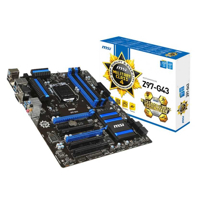 Descripción MSI Z97-G43. tipos de memoria compatibles: DDR3-SDRAM, Tipo de ranuras de memoria: DIMM, Memoria interna: 32 GB. Familia de procesador: Intel, Procesador compatible: Celeron, Core i3, Core i5, Core i7, Pentium, Socket de procesador: Socket H3 (LGA 1150). Interfaces de unidad de disco duro soportadas: SATA, Serial ATA III. Controlador LAN: Realtek RTL8111E. Componente para: PC, Familia de componentes de tarjeta madre: Intel, Circuito integrado de tarjeta madre: Intel Z97