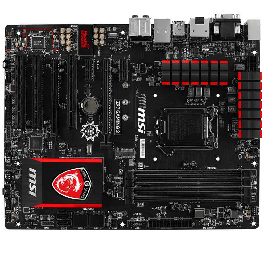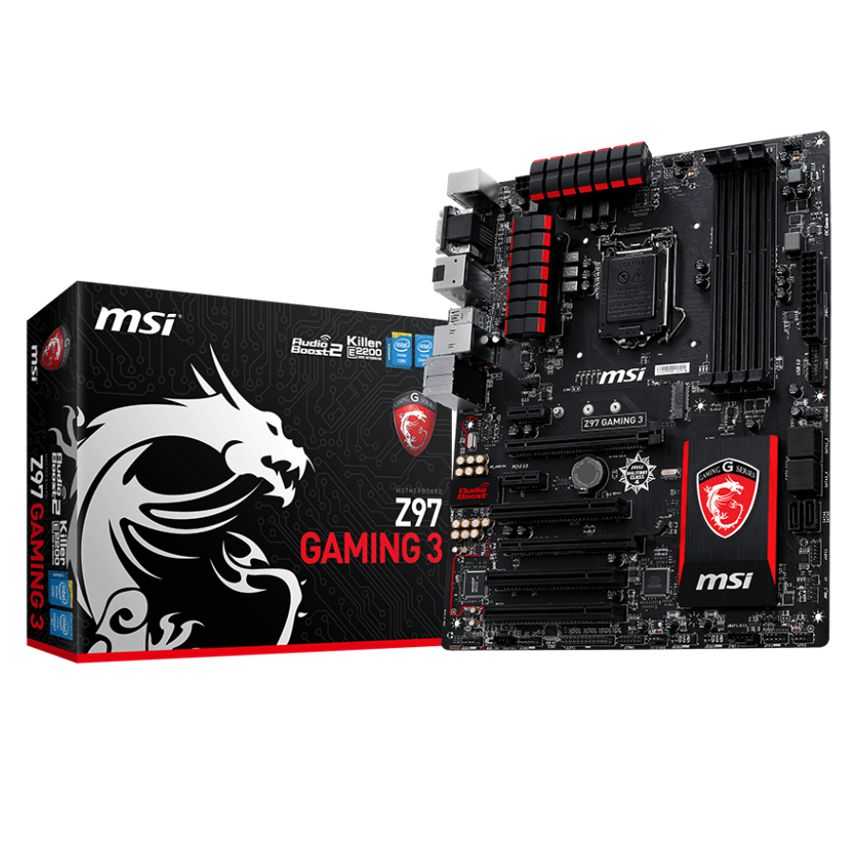Descripción MSI Z97 GAMING 3. tipos de memoria compatibles: DDR3-SDRAM, Tipo de ranuras de memoria: DIMM, Canales de memoria: Dual. Familia de procesador: Intel, Procesador compatible: Celeron, Pentium, Socket de procesador: Socket H3 (LGA 1150). Interfaces de unidad de disco duro soportadas: SATA. Componente para: PC, Familia de componentes de tarjeta madre: Intel, Circuito integrado de tarjeta madre: Intel Z97. Soporte para proceso paralelo: 2-Way CrossFireX, Máxima resolución: 4096 x 2304 Pixeles