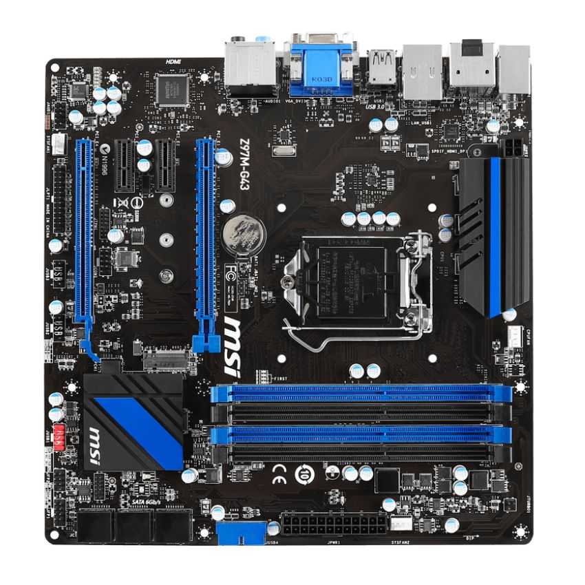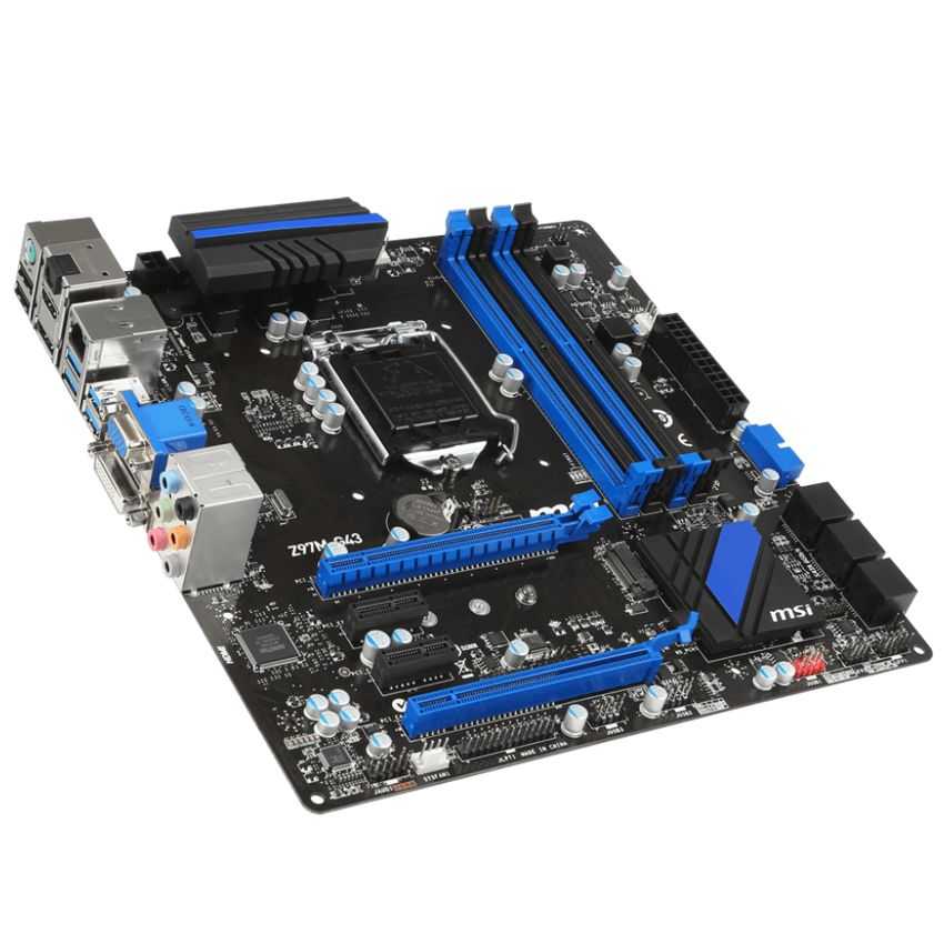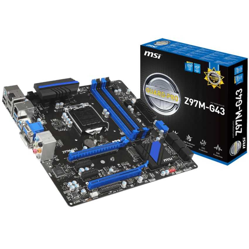 Descripción MSI Z97M-G43. tipos de memoria compatibles: DDR3-SDRAM, Tipo de ranuras de memoria: DIMM, Memoria interna: 32 GB. Familia de procesador: Intel, Procesador compatible: Celeron, Core i3, Core i5, Core i7, Pentium, Socket de procesador: Socket H3 (LGA 1150). Interfaces de unidad de disco duro soportadas: SATA, Serial ATA II, Serial ATA III. Controlador LAN: Realtek 8111G, Tipo de interfaz ethernet: Gigabit. Componente para: PC, Familia de componentes de tarjeta madre: Intel, Circuito integrado de tarjeta madre: Intel Z97