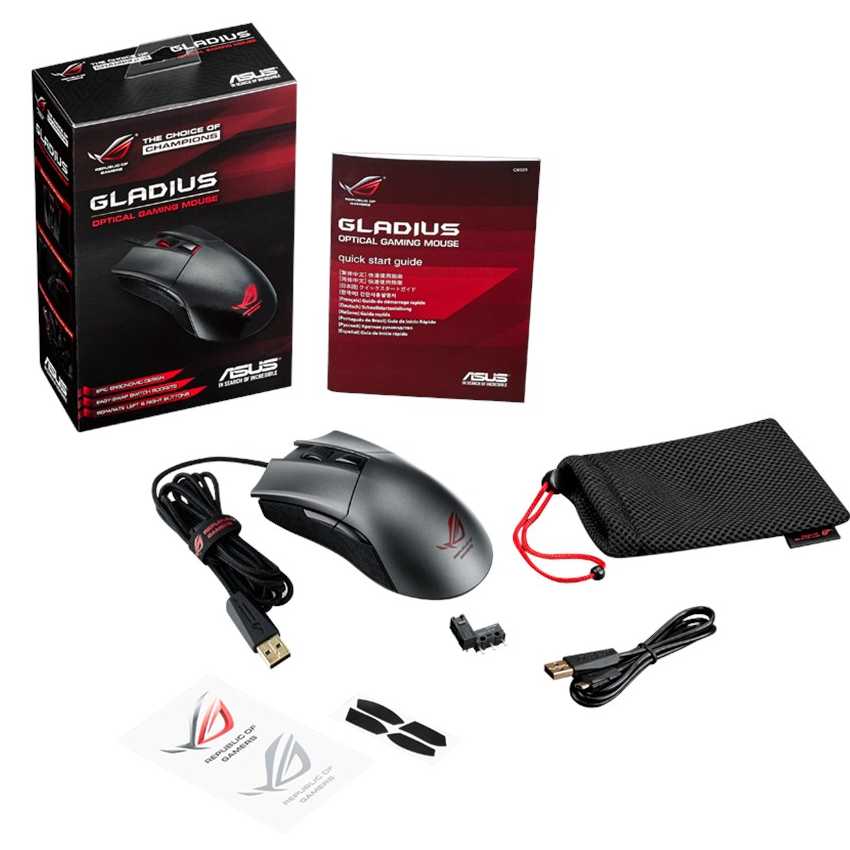 Descripción ASUS Rog Gladius. Interfaz del dispositivo: USB, Utilizar con: Juego, Tecnología de detección de movimientos: Óptico. Color del producto: Negro, Gris, Factor de forma: mano derecha. Ancho: 12,6 cm, Profundidad: 6,7 cm, Altura: 4,5 cm. Cables incluidos: USB