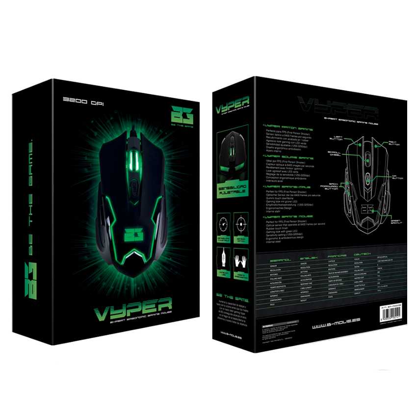 Descripción Aumenta tu capacidad de ataque y hazte con la victoria antes que tus rivales. Con el nuevo raton Vyper de BG, conseguirás alcanzar el éxito en el fragor de la batalla. DPIs ajustables hasta 3200, sensor óptico óptimo para shooters, atractivos LEDS verdes y una gran estabilidad gracias a su acero interno. Da un paso más, hacia una nueva dimensión gaming.