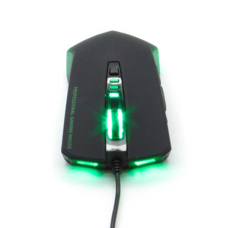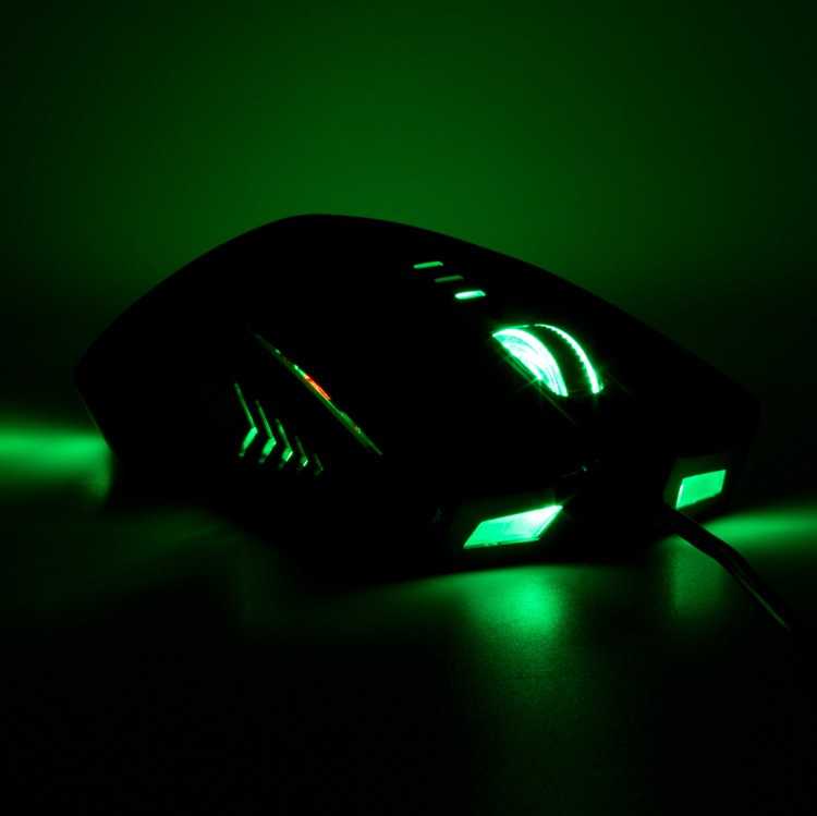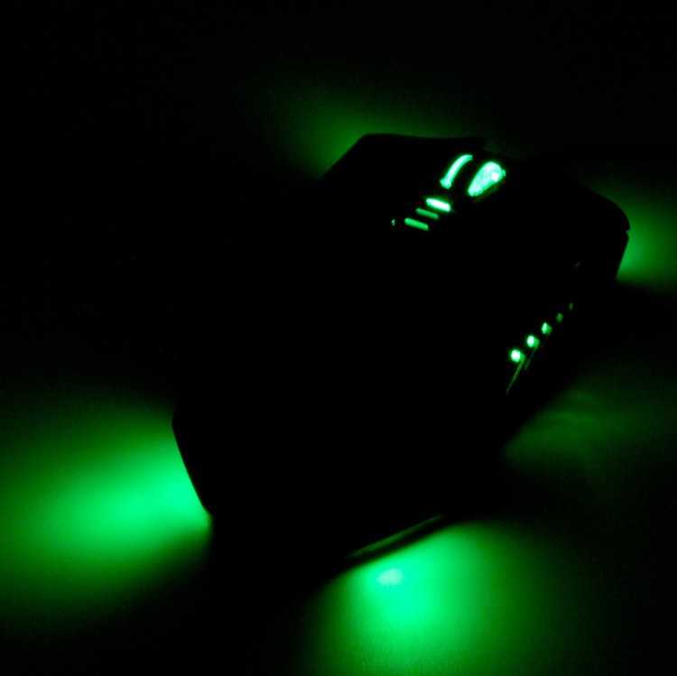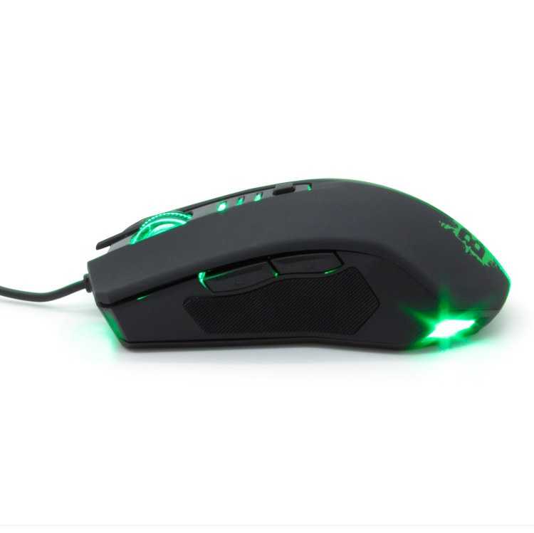 Ratón gaming con resolución ajustable y acabado en suave ''rubber'' para un cofort extra en largas sesiones de juego. Incluye LEDs verdes en la parte frontal, trasera y superior para un perfecto entorno gaming.