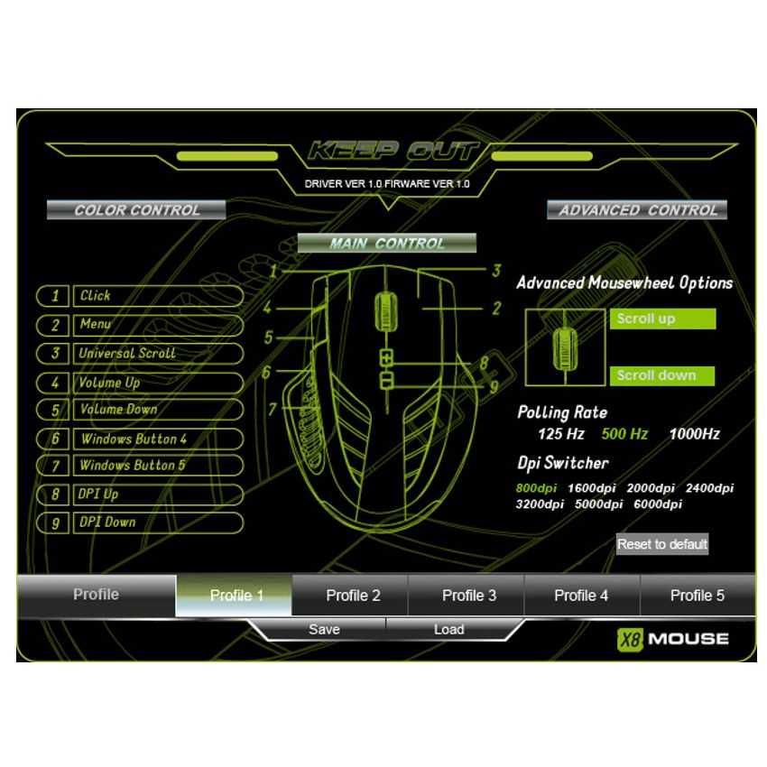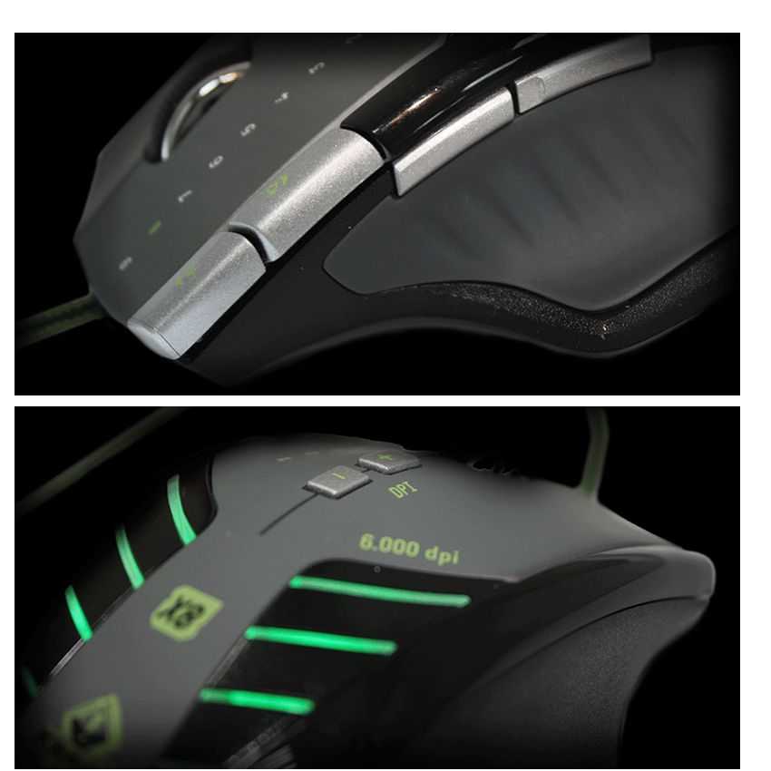 Velocidad: 150 pulgadas por segundo 9 pesos de 2.8 gramos ajustables Sensor Laser AVAGO: AVAGO 9500 Cable de nylon alta duración de 1,8 m Fotogramas por segundo: 12000fps Aceleración: 30 G 9 Botones totalmente programables 7Niveles DPI ajustables (por defecto 800/1600/2000/2400/3200/5000/6000) Polling Rate ajustable: 125Hz/500Hz/1000Hz