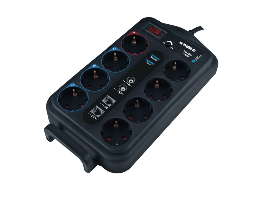 Incluye 8 enchufes tipo Schuko con toma de tierra, entre ellos uno Maestro que activa automáticamente los tres Esclavos.