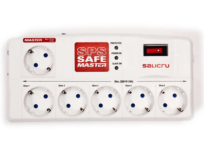 Salicru Regleta 5+1 (Master) Tomas Filtro EMI/RFI Los modelos de las serie SPS SAFE de SALICRU son los mejores aliados para la protección de la electrónica en la oficina y el hogar: PC, impresora, escáner, fotocopiadora, router, hub/switch, HDD externo, fax, módem, teléfono, TV/LCD, home cinema, Hi-Fi, DVD, SAT, TDT, domótica, videoconsola, electrodomésticos,…