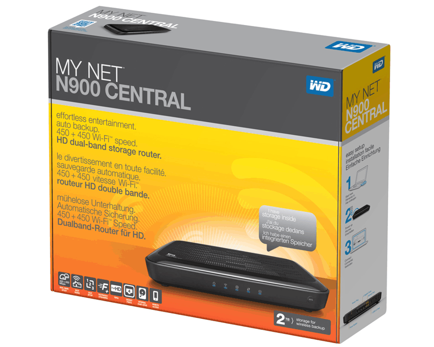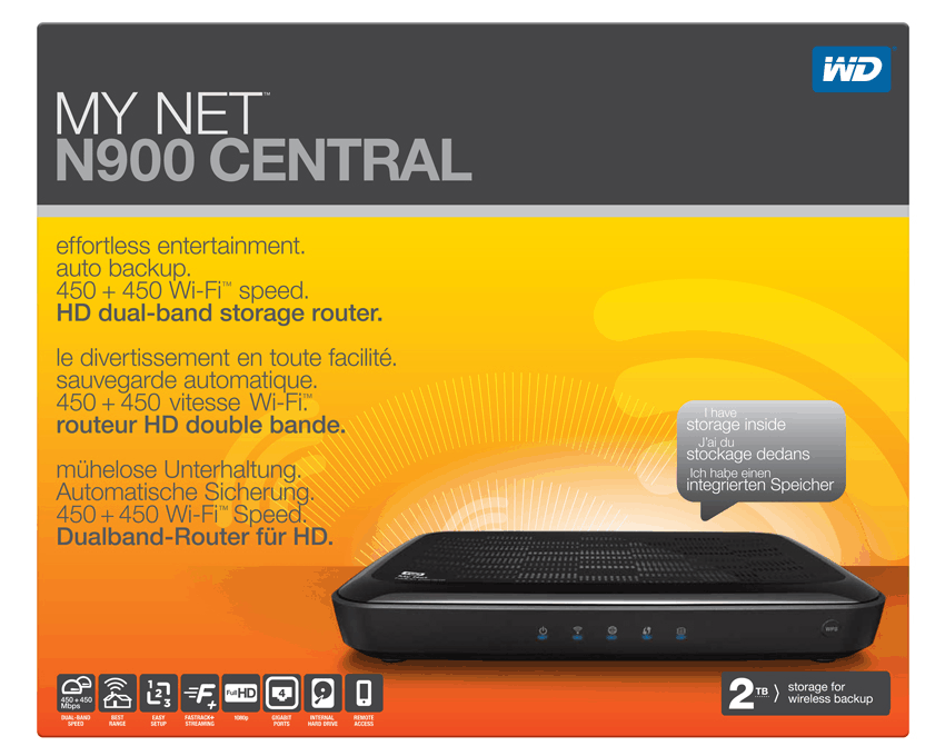 My Net N900 Central 2TB, IEEE 802.11 n/g/b/a, 450Mbps @ 2.4/5GHz, 4 x 10/100/1000 Ethernet, 1 x USB 2.0Una brillante transmisión del entretenimiento en alta definición con FasTrack. La tecnología exclusiva FasTrack Plus ofrece una transmisión uniforme de alta definición y con gran calidad en todos los dispositivos conectados. La prioridad inteligente en tiempo real quiere decir que lo primero es el entretenimiento.La velocidad que sigue su ritmo. Con velocidades de banda dual de hasta 450 Mbps en las bandas de 2,4 y 5 GHz, My Net N900 ofrece las máximas velocidades Wi-Fi para su entretenimiento.*Más ancho de banda, menos interferencias. Doble sus anchos de banda de 2,4 y 5 GHz que trabajan simultáneamente para aumentar la tasa de transmisión y reducir las interferencias. Más ancho de banda para más dispositivos conectados.Cree su propia nube personal. Acceda a sus archivos, música y fotos con teléfonos inteligentes y tabletas usando las aplicaciones gratuitas para dispositivos móviles de los visualizadores de archivos WD 2go y WD Photos. Conecte My Net 900 Central con su disco duro incorporado para disponer de una solución de nube personalizada al instante. Mantenga sus archivos a salvo en casa y siempre con usted.Estará transmitiendo en el acto. La configuración simplificada mediante CD de WD o mediante navegador está diseñada para permitirle funcionar en unos pocos pasos. Utilice el sencillo CD de configuración o configúrelo de forma inalámbrica desde el iPad u otro dispositivo conectado. La intuitiva interfaz de usuario está diseñada para pantallas táctiles, permitiendo la configuración instantánea desde un teléfono inteligente o una tableta.Le damos cobertura. La tecnología de amplificador de amplio margen reduce la interferencia y las antenas adicionales amplían la señal inalámbrica para proporcionar cobertura en casas grandes con varios pisos. Transmita sus películas, programas, juegos, vídeos y música a todos los portátiles, tabletas y teléfonos inteligentes en cualquier parte de la casa.Usted tiene el control. My Net Dashboard facilita la personalización, supervisión o cambio de la configuración de la red. Sencilla vista unificada de los controles de acceso a contenidos, la seguridad de Internet, el nombre y contraseña de red, así como de la configuración de impresora y escáner y de las unidades de almacenamiento conectadas.Controles de contenidos y seguridad de Internet. Utilice los controles de contenidos disponibles para limitar el tipo de sitios web que los niños pueden ver, establezca límites de acceso y de horas para el uso de Internet y configure la seguridad para prevenir ataques de software dañino o software espía.4 puertos Ethernet de alta capacidad Puertos de alta velocidad extra para los dispositivos conectados: consolas de juegos de alta definición, reproductores multimedia, reproductores de Blu-ray Disc?, etc. Cada uno de los puertos tiene una velocidad diez veces superior a la de Ethernet de alta velocidad.Puerto USB. El cómodo puerto USB permite añadir de un modo sencillo a la red dispositivos de almacenamiento externo, impresoras compartidas, escáneres y otros dispositivos USB.Conecte fácilmente y amplíe su red. Con UPnP, My Net N900 Central hace que sea fácil descubrir y configurar automáticamente otros dispositivos de la red para poder disfrutar del mejor entretenimiento.Tenga la red preparada y funcionando. La herramienta de diagnósticos de red que se incluye supervisa su red por usted. Muestra cuántos dispositivos están en su red, analiza continuamente los aspectos relacionados con la conectividad de red y ayuda a su corrección en el caso de fallos, para que pueda volver a funcionar lo más rápidamente posible.Comparta su red con invitados. Configure su propia zona inalámbrica segura en casa para que sus invitados puedan acceder de forma inalámbrica a la red. La protección mediante contraseña le permite controlar el nivel de acceso a solo la navegación inalámbrica por Internet o al acceso ampliado a los invitados de los archivos de red compartidos o a impresoras inalámbricas compartidas.Configuración por medio de botón (WPS). Un solo botón puede conectar fácilmente nuevos dispositivos a su red inalámbrica. Es tan fácil como sincronizar el teléfono móvil con un dispositivo Bluetooth®. En segundos podrá ampliar su red para incluir ordenadores, teléfonos inteligentes, tabletas y otros dispositivos inalámbricos activados por UPnP.Pv6 habilitado. Tenga preparada la red para el futuro con la última tecnología de protocolos de Internet.QoS avanzada (WMM) Además del estándar QoS avanzada que establece la prioridad de los dispositivos, los Routers My Net disponen de la tecnología exclusiva FasTrack Plus que establece la prioridad inteligente en tiempo real de películas de Internet, programas, juegos y videochat para obtener una transmisión del entretenimiento en alta definición con la mayor uniformidad posible.Herramienta de diagnostico de la red. Con la herramienta de diagnóstico de la red puede ver fácilmente el número y el tipo de dispositivos que hay en su red. La herramienta analiza continuamente los problemas relacionados con la conectividad de red y ayuda a su corrección cuando se producen para que pueda tener copia de seguridad y volver a funcionar lo más rápidamente posible.WPA/WPA2, servidor de seguridad SPI. Protegemos su red inalámbrica con WPA/WPA2 y el servidor de seguridad SPI. Solo se pasan los datos que se desee, se bloquea el acceso de hackers y se protege la red.Amplificadores de antena. Integrados en el elegante diseño de los Routers hay varios amplificadores de antena que ayudan a reforzar el alcance del Router para que pueda disponer de una excelente cobertura y velocidad en prácticamente cualquier tamaño de casa.