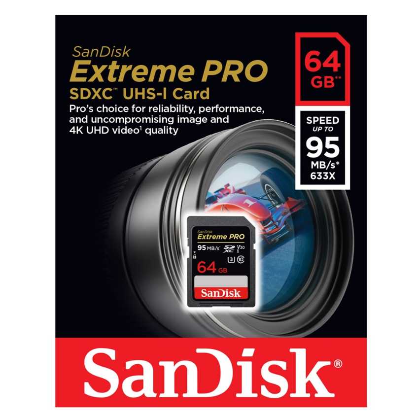Descripción Sandisk Extreme Pro. Capacidad: 0,064 GB, Tipo de tarjeta flash: SDXC, Clase de memoria flash: Class 3. Color del producto: Negro. Ancho: 101,6 mm, Profundidad: 14 mm, Altura: 152,4 mm