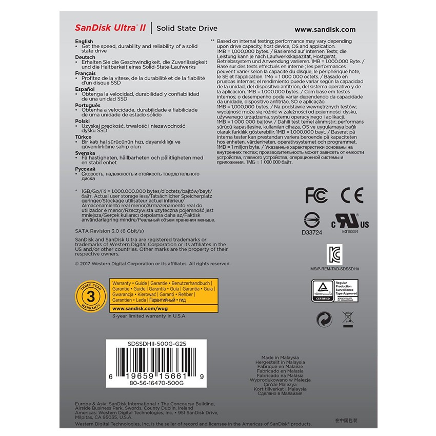 Descripción Sandisk Ultra 3D. Disco de estado sólido, capacidad: 500 GB. Factor de forma de disco SSD: 2.5". Interfaces de disco de estado sólido: Serial ATA III, Velocidad de lectura: 560 MB/s, Velocidad de escritura: 530 MB/s, Velocidad de transferencia de datos: 6 Gbit/s, Componente para: PC