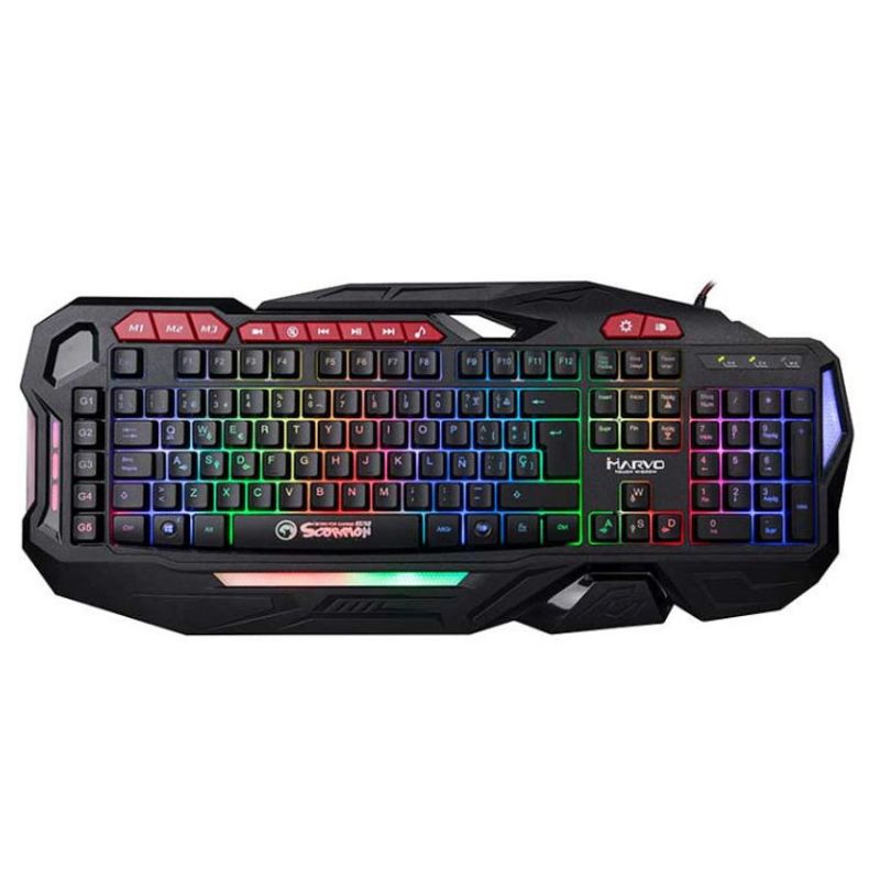 Descripción TECLADO GAMING LED SCORPION KG760 TECLADO ESTILO MEMBRANA TECLAS RETROILUMINADAS CON LUCES RGB EN 3 EFECTOS MARCO DE ACERO DE 1,2MM 5 TECLAS MACRO CONFIGURABLES, 6 TECLAS MULTIMEDIA, 3 TECLAS DE MODO, 2 TECLAS DE AJUSTE DE LUZ 26 TECLAS ANTI GHOSTING BLOQUEO DE TECLA WINDOWS TECLAS GRABADAS A LÁSER CABLE TRENZADO DE 1,6M USB CHAPADO EN ORO DISTRIBUCIÓN EN ESPAÑOL REPOSAMUÑECAS TAMAÑO 475 X 205 X 30 MM PESO 1247 G