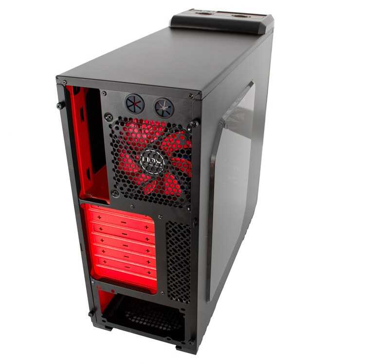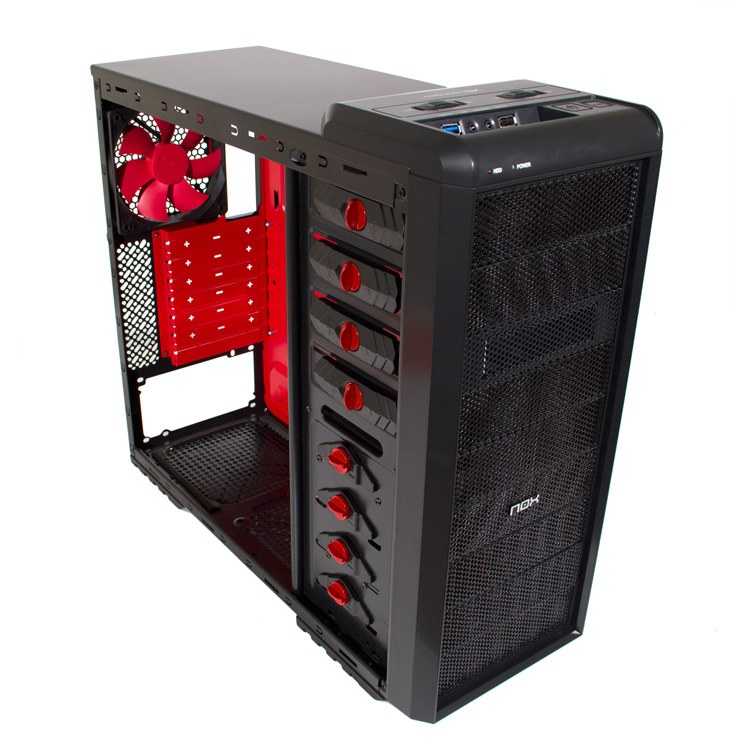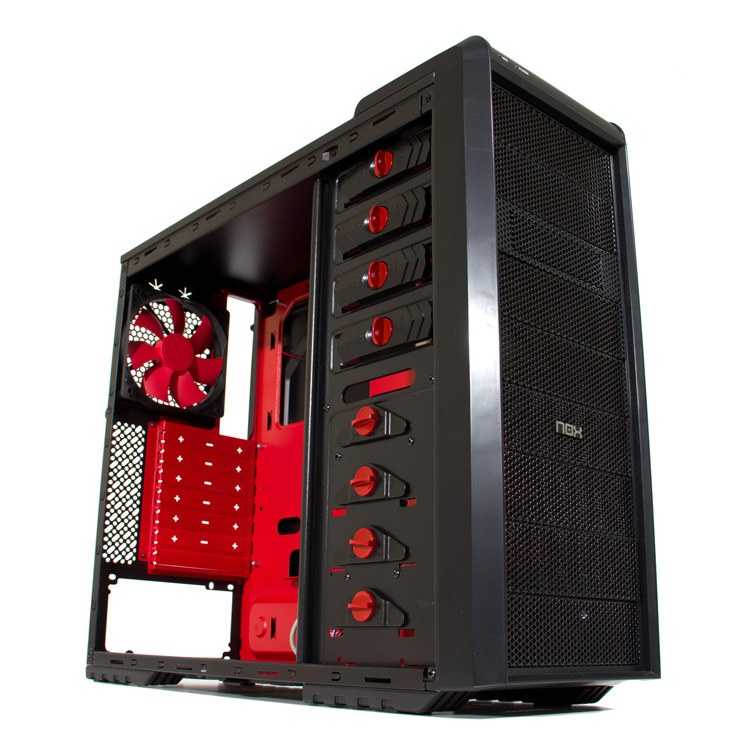Soporte para placa base, sistema screwless, slots PCI y aspas del ventilador trasero en color rojo