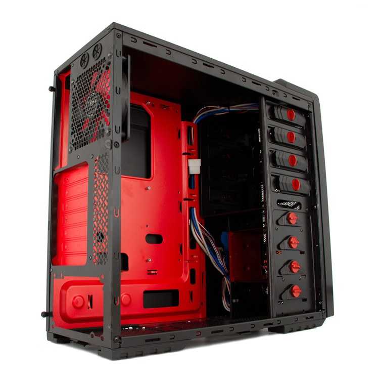 Semitorre ATX con interiores en color rojo. Capacidad para instalar hasta 4 ventiladores de 120 mm y metal mesh en la parte frontal. Gran capacidad para instalar discos duros y compatible con gráficas de gran tamaño.