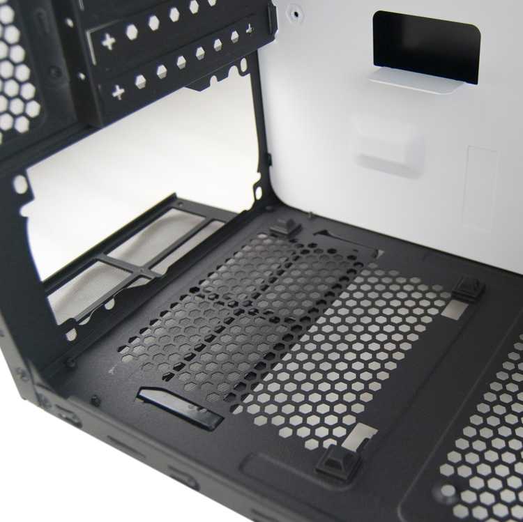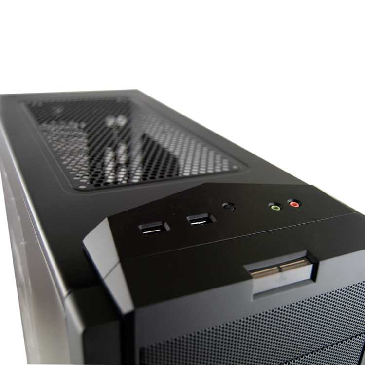 Semitorre ATX con puerto de alta velocidad USB 3.0 incluido. Interiores negros con detalles en color blanco e instalación de la fuente de alimentación en la parte inferior de la caja.