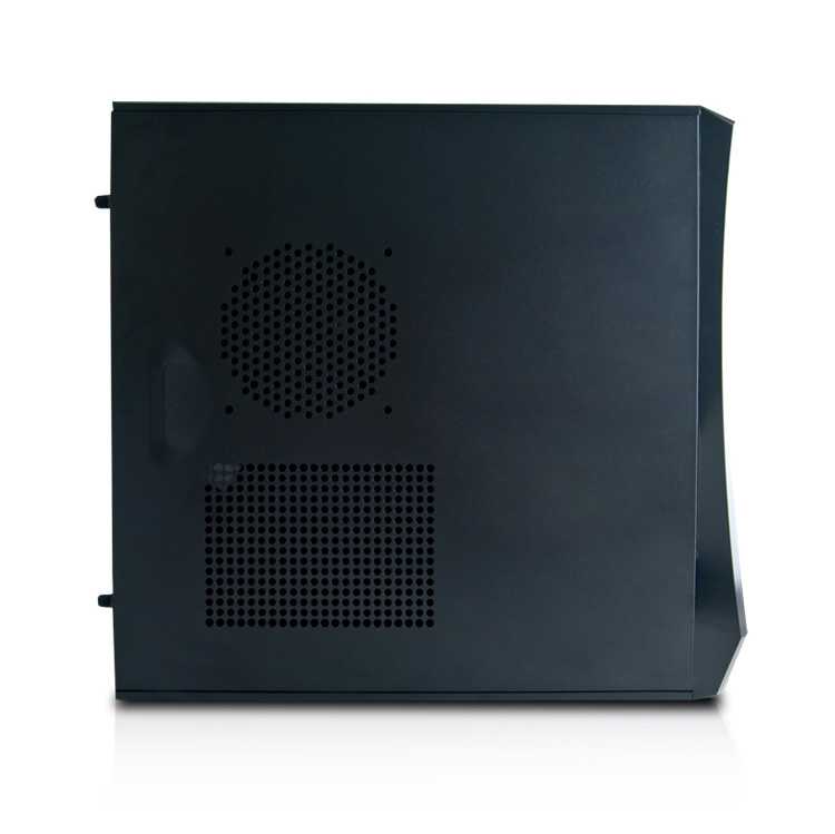 Caja semitorre ATX con interiores en color negro y un elegante panel frontal ligeramente curvado. Compatible con gráficas de gran tamaño y con LED azul en el botón I/O.