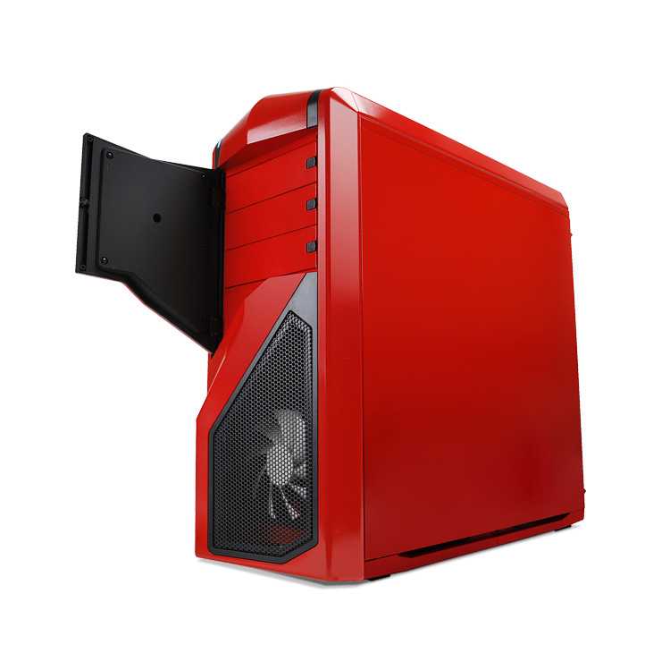 Semitorre ATX en color rojo con un sistema de instalación de unidades fácil y sencillo. Incluye puerto USB 3.0 de alta velocidad y tres ventiladores preinstalados.