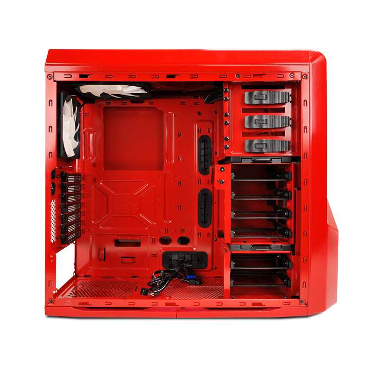 · Soporte ajustable para orientar el flujo de aire de un ventilador de 120/140 mm en varias direcciones · Caja HDD extraíble para permitir mas espacio para tarjetas gráficas de última generación · Raíles para instalar los HDD de una forma rápida y fácil · Ventana acrílica en el panel lateral · Incluye puerto de alta velocidad USB 3.0 · Controlador de ventiladores de 30W con 3 posiciones · Compatible con refrigeración líquida: espacio para un radiador de 240 mm en la parte superior y huecos para tubos · Sistema para ordenador los cables en el interior · Exterior e interior en color rojo · Compatible con VGAs de grandes dimensiones · Soporte para placa base con recorte para facilitar la instalación de nuevos disipadores para el microprocesador · Sistema de instalación de unidades sin necesidad de usar tornillos · Capacidad para instalar hasta 6 ventiladores · Soportes para la fuente y patas de goma para reducir la vibración · Instalación de la fuente en la parte inferior · Dimensiones máximas: - VGA: 230 mm con HDD, 330 mm sin HDD