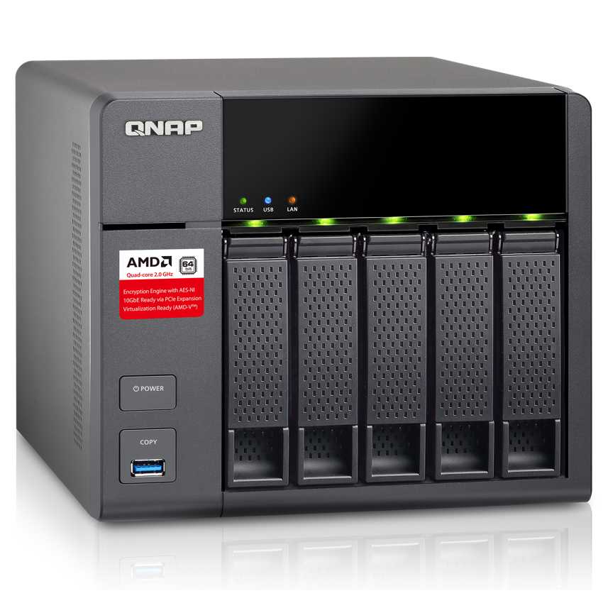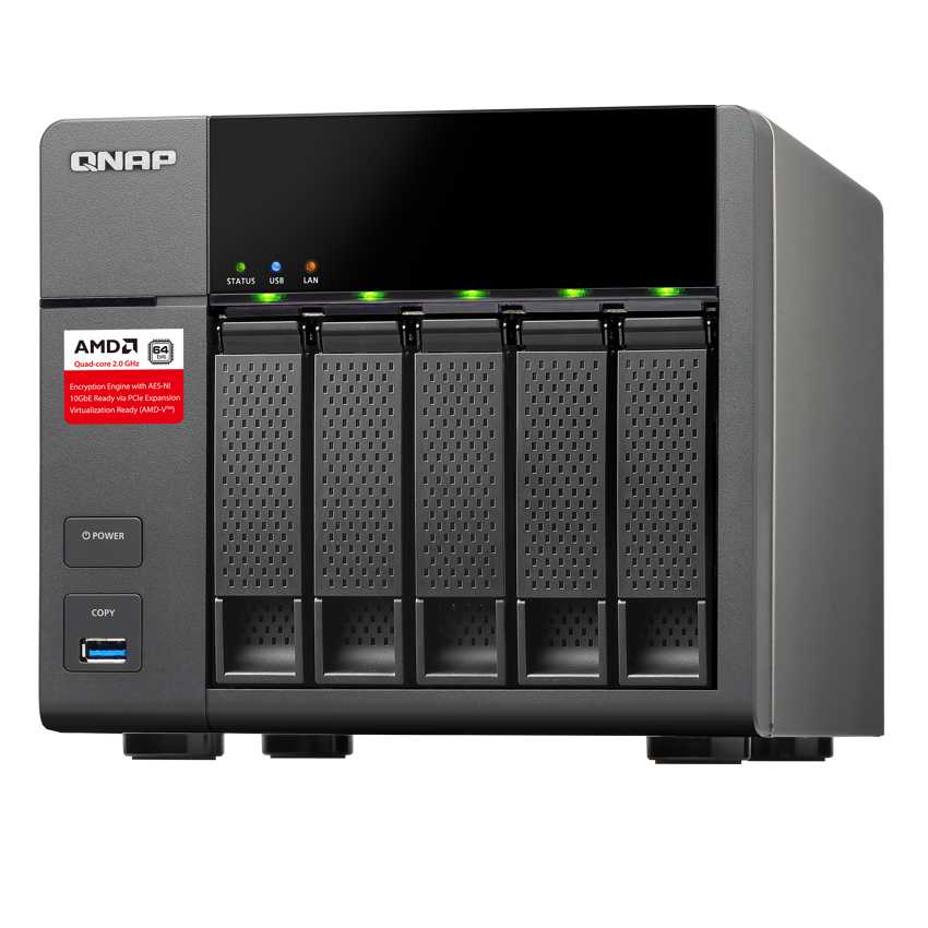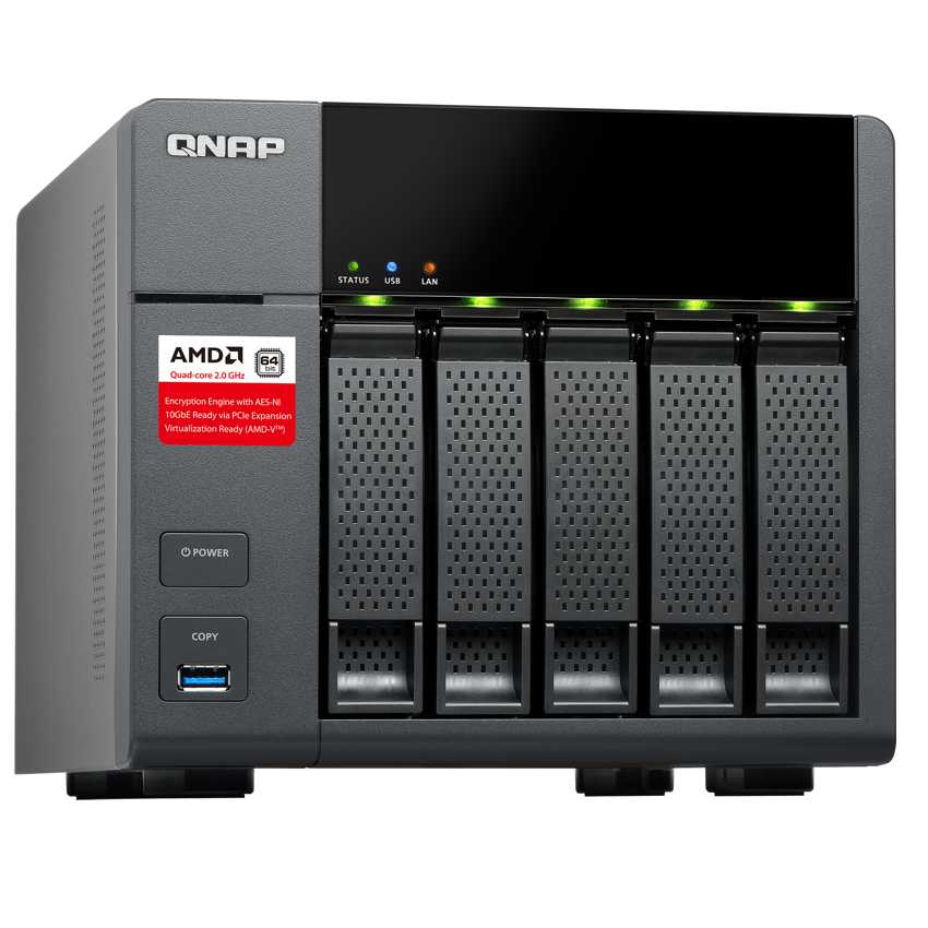 Descripción QNAP TS-563. Capacidad total de almacenamiento instalada: 0 GB, Tipos de unidades de almacenamiento admitidas: Unidad de disco duro, SSD, Interfaz de unidad de almacenamiento: Serial ATA III. Frecuencia del procesador: 2 GHz. RAM interna: 2 GB, Tipo de memoria RAM interna: DDR3L, RAM máximo soportado: 16 GB. Ethernet LAN, velocidad de transferencia de datos: 1000 Mbit/s, Protocolos de red compatibles: CIFS/SMB, AFP, NFS, FTP, FTPS, SFTP, TFTP, HTTP(S), Telnet, SSH, iSCSI, SNMP, SMTP, SMSC. Tipo de chasis: Torre, Tipo de enfriamiento: Activo, Color del producto: Negro