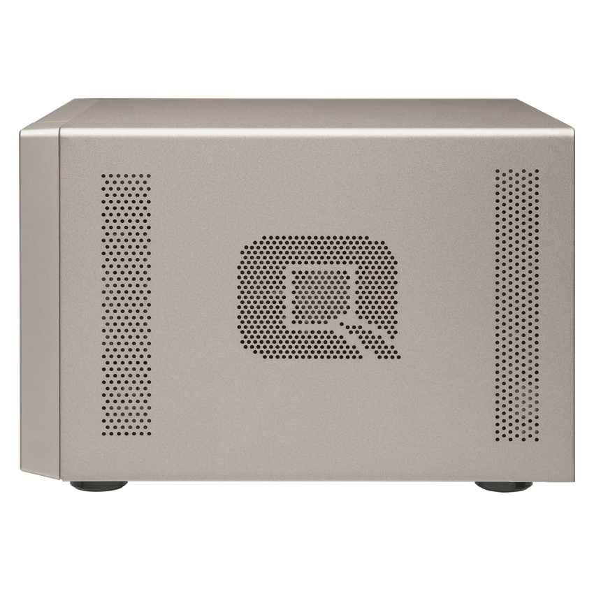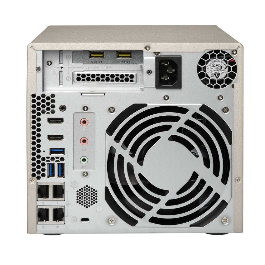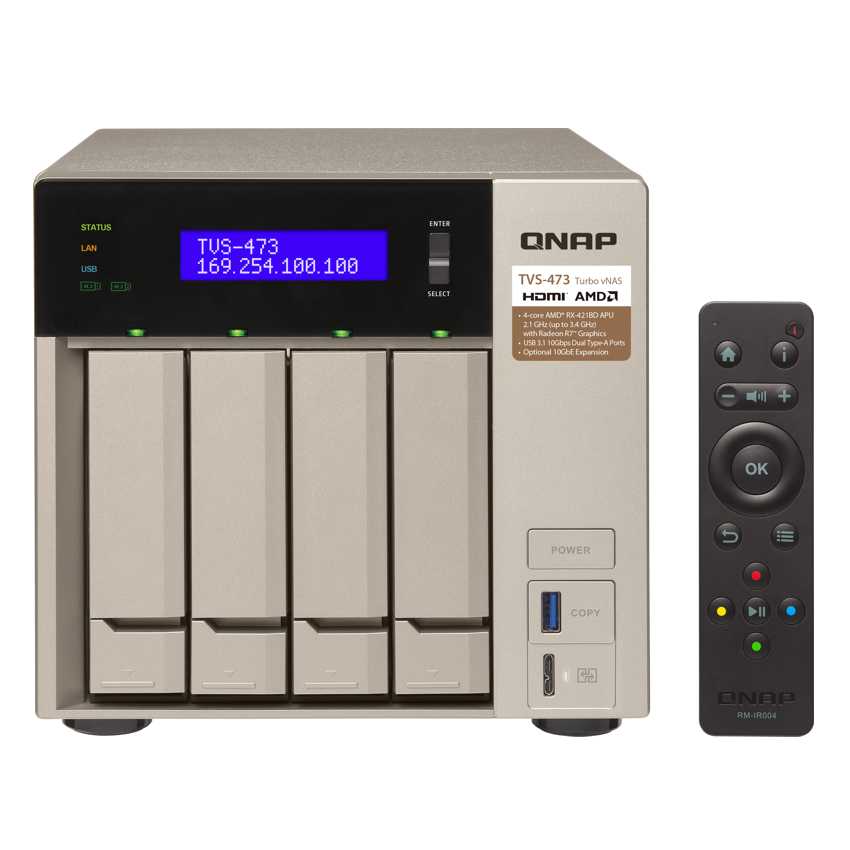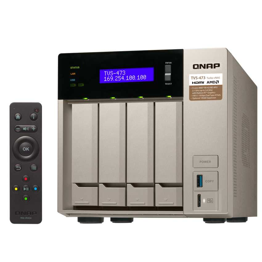 El TVS-473 cuenta con una unidad de procesamiento acelerado (APU) integrada AMD que combina el rendimiento excepcional de la CPU con los Gráficos R7 AMD Radeon™, proporcionando así una solución NAS con un alto rendimiento y una alta eficiencia energética. Construido con un vanguardista diseño metálico y rematado con un elegante acabado dorado, el TVS-473 cuenta con una potente CPU de cuatro núcleos, motor de cifrado de hardware AES-NI, hasta 64 GB de RAM, USB 3.1 (10Gbps) y capacidad de ampliación a 10GbE con un rendimiento excepcional. Junto con el increíble USB QuickAccess, la salida HDMI 4K y la aceleración de decodificación y codificación de vídeo en 4K H.264, el TVS-473 que se ejecuta en el nuevo sistema operativo QTS 4.3 de 64 bits proporciona una óptima experiencia audiovisual y un sistema de nube privada completo. Solución de almacenamiento unificado NAS e iSCSI-SAN (IP-SAN) GPU Radeon™ R7 integrada para almacenamiento y reproducción de video 4K Capacidad de ampliación a 10GbE, solución de almacenamiento altamente eficiente para la virtualización y la edición e intercambio de video en HD Puerto USB QuickAccess para accede a los archivos sin necesidad de una conexión de red Caché SSD M.2 y tecnología Qtier que de manera conjunta llevan a cabo una eficiencia de almacenamiento optimizada Admite virtualización, almacenamiento centralizado, backup, intercambio, y recuperación ante desastres QmailAgent para la gestión centralizada de correo, Qsirch, una herramienta de búsqueda de texto completo; Qcontactz para almacenar y gestionar los contactos de forma centralizada. Usa el NAS como un PC con la exclusiva tecnología QvPC y la visualización 4K El nuevo sistema de video-vigilancia QVR Pro permite espacio dedicado al almacenamiento para los datos de video-vigilancia en el NAS, y aprovecha las ventajas de la capacidad de gestión de almacenamiento desde el QTS. Construya un sistema de karaoke personal con una salida de audio de alta calidad utilizando la aplicación OceanKTV. Especificaciones