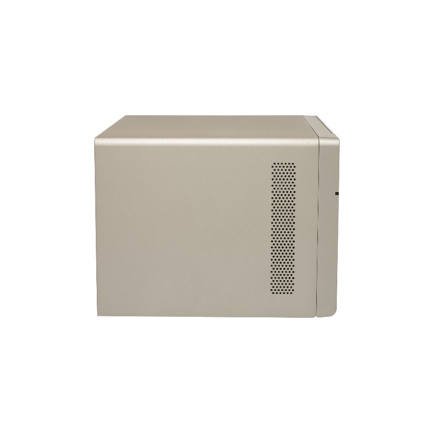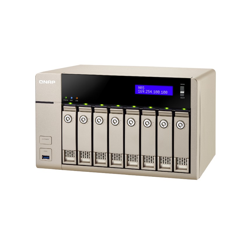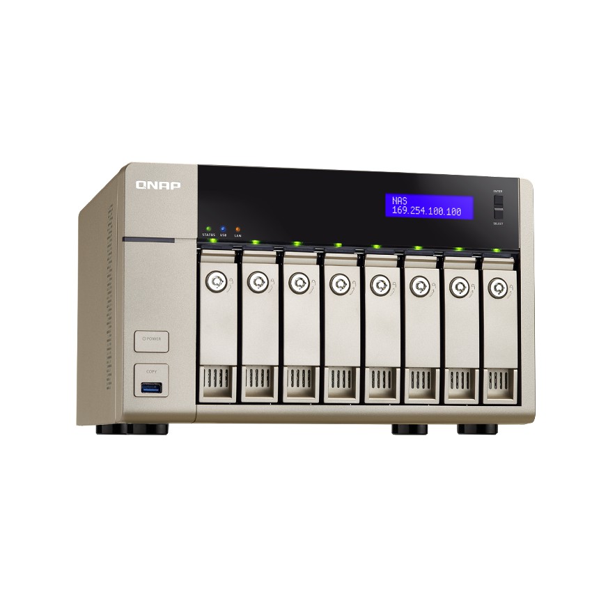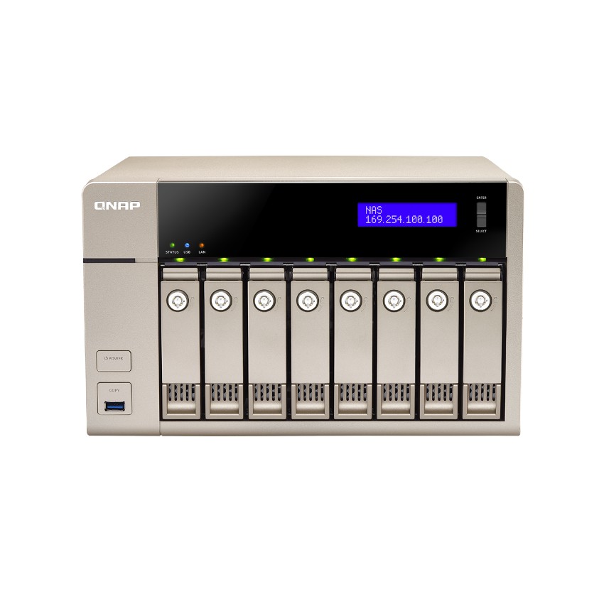 Especificaciones Unidades de almacenamiento instaladas: No Tipos de unidades de almacenamiento admitidas: Unidad de disco duro, SSD Número de unidades de almacenamiento compatibles: 8 Interfaz de unidad de almacenamiento: Serial ATA II, Serial ATA III Tamaño de la unidad de almacenamiento: 2.5/3.5" Compatibilidad con RAID: Si Niveles RAID: 0, 1, 5, 6, 10, JBOD Receptáculos de unidades hot-swap: Si Sistemas de archivos soportados: ext3, ext4, FAT32, HFS+, NTFS Frecuencia del procesador: 2,4 GHz Número de núcleos de procesador: 4 RAM interna: 8 GB Tipo de memoria RAM interna: DDR3L RAM máximo soportado: 16 GB Ranuras de memoria: 2 Memoria Flash: 512 MB Ethernet: Si Ethernet LAN, velocidad de transferencia de datos: 10,100,1000 Mbit/s DHCP, cliente: Si DHCP, servidor: Si Jumbo Frames, soporte: Si Soporte iSCSI: Si Conexión de redes: Si Protocolos de red compatibles: CIFS/SMB, AFP (v3.3), NFS(v3), FTP, FTPS, SFTP, TFTP, HTTP(S), Telnet, SSH, iSCSI, SNMP, SMTP, and SMSC Ethernet LAN (RJ-45) cantidad de puertos: 2 Puerto USB: Si USB 3.0 (3.1 Gen 1) Type-A ports quantity: 5 Número de puertos HDMI: 2 Tipo de chasis: Torre Color del producto: Oro Tipo de enfriamiento: Activo Número de ventiladores: 2 Diámetro de ventilador: 12 cm Indicadores LED: Si Pantalla incorporada: Si Tipo de visualizador: LCD Ranura para cable de seguridad: Si Tipo de ranura de bloqueo del cable: Kensington Tipo: NAS Función de copia de seguridad: Si Vibrador: Si Soporte multilinguaje: Si Sistema operativo instalado: QNAP Turbo System Versión de sistema operativo: 4.1 Algoritmos de seguridad soportados: 256-bit AES, HTTPS, SSH, SSL/TLS Administación basada en web: Si Botón de restaurar: Si Interruptor de encendido/apagado integrado: Si Sistema operativo Windows soportado: Si Sistema operativo Linux soportado: Si Sistema operativo MAC soportado: Si Capacidad de la fuente de alimentación (PSU): 250 W Consumo energético: 70,45 W Consumo energético (en suspensión): 2,35 W Voltaje de entrada AC: 100-240 V Frecuencia de entrada AC: 50/60 Hz Ancho: 29,8 cm Profundidad: 23,5 cm Altura: 18,5 cm Peso: 7,83 kg Peso del paquete: 8,9 kg Cables incluidos: Corriente alterna, LAN (RJ-45) Intervalo de temperatura operativa: 0 - 40 °C Intervalo de humedad relativa para funcionamiento: 5 - 95%