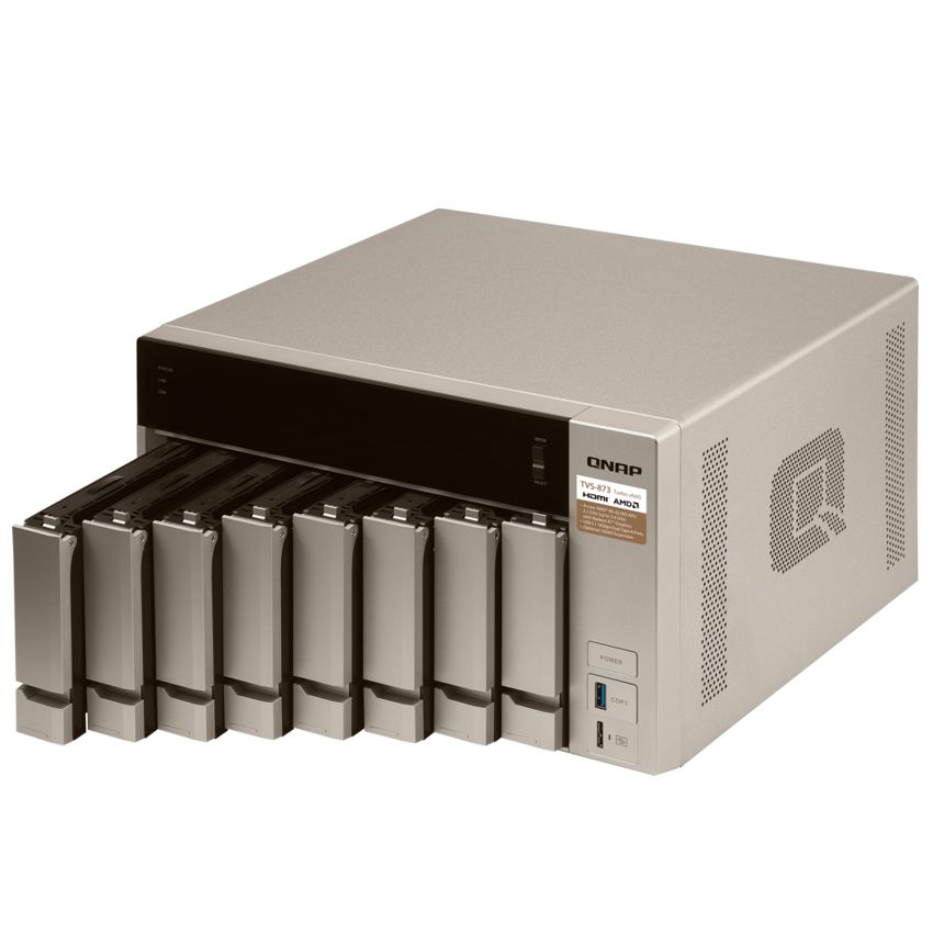 Descripción El TVS-873 cuenta con una unidad de procesamiento acelerado (APU) integrada AMD que combina el rendimiento excepcional de la CPU con los Gráficos R7 AMD Radeon?, proporcionando así una solución NAS con un alto rendimiento y una alta eficiencia energética. Construido con un vanguardista diseño metálico y rematado con un elegante acabado dorado, el TVS-873 cuenta con una potente CPU de cuatro núcleos, motor de cifrado de hardware AES-NI, hasta 64 GB de RAM, USB 3.1 (10Gbps) y capacidad de ampliación a 10GbE con un rendimiento excepcional. Junto con el increíble USB QuickAccess, la salida HDMI 4K y la aceleración de decodificación y codificación de vídeo en 4K H.264, el TVS-873 que se ejecuta en el nuevo sistema operativo QTS 4.3 de 64 bits proporciona una óptima experiencia audiovisual y un sistema de nube privada completo.