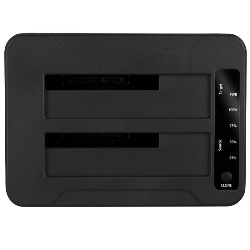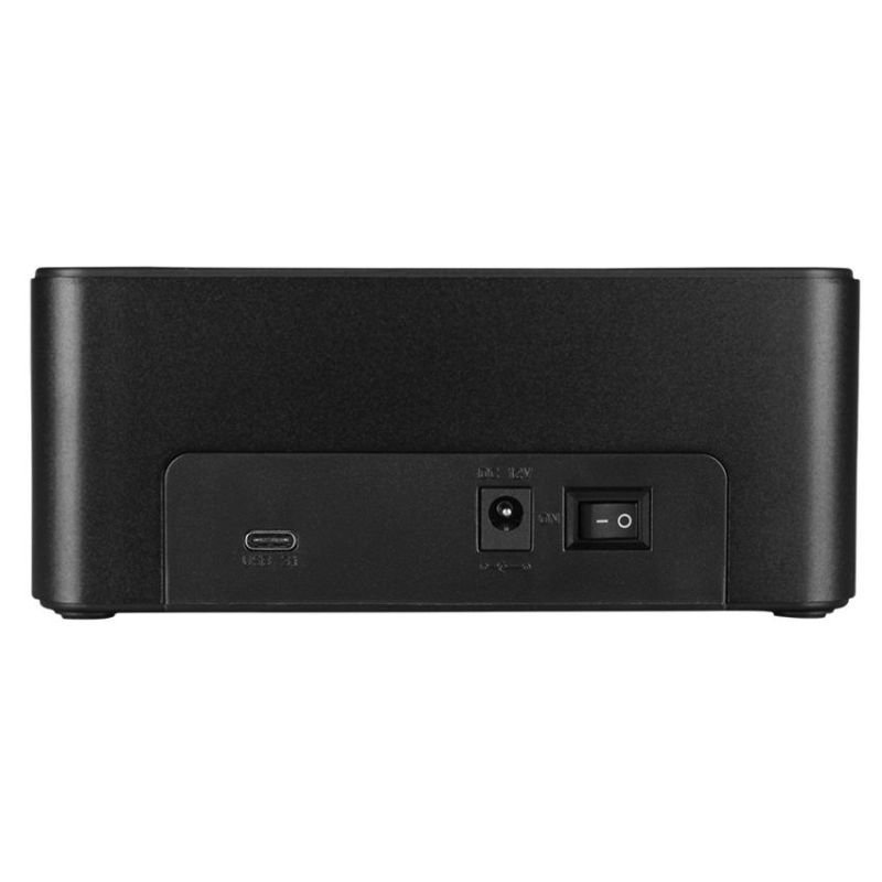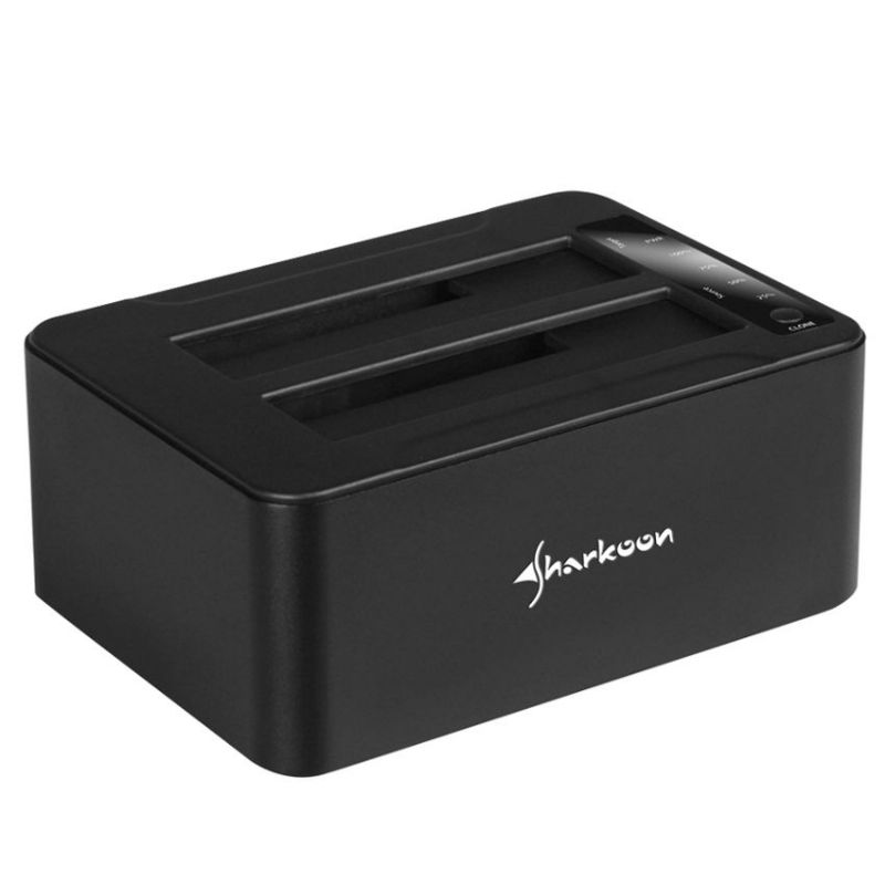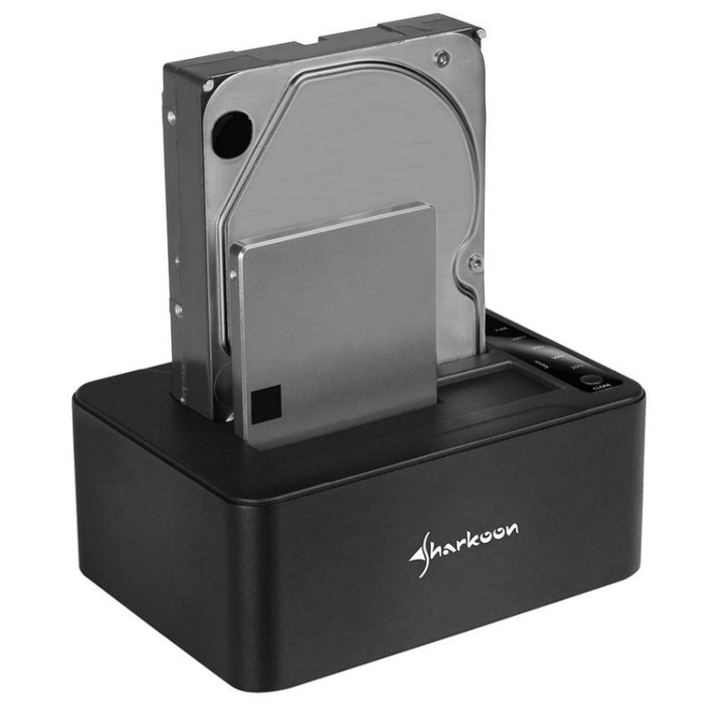 Descripción El docking de la sencillez Así como ocurre con todos los dual docking stations de Sharkoon, el QuickPort Duo Clone USB 3.1 Type C conecta rápidamente hasta dos 2,5” o 3,5” SATA HDD/SSDs a un ordenador: los discos duros se insertan simplemente en las bahías del QuickPort y el dispositivo se conecta por medio del conector incluido tipo C del cable USB en un puerto tipo C disponible en el ordenador. Sólo tienes que conectar el adaptador de corriente y ya está listo. El QuickPort es fácil de manejar, con su elegante y robusta estructura de aluminio, y es extremadamente funcional. Gracias a su interfaz USB 3.1, los datos se pueden transferir a una velocidad de hasta 10 gigabits por segundo – y eso no es todo.Clonea discos duros sin el ordenador La característica prominente del QuickPort, a parte de su moderna conectividad, es la función clon autónoma integrada, que nos permite clonar los discos duros que hemos insertados entre sí sin la necesidad de tener conectado el dispositivo al ordenador. Una vez se insertan los discos duros, simplemente se debe presionar el botón de función clon. El progreso de clonación se puede comprobar en cualquier momento a través de los indicadores LED situados en la parte superior del dispositivo. El proceso puede ser incluso más rápido al usar los software FlashCopy y CloneDrive2 incluidos.Funciones inteligentes de Software El software en inglés para sistema Windows complementa la función clon autónoma del QuickPort con las funciones de copia adicional y clon, también para discos duros instalados en PC. Con FlashCopy los archivos se copian rápidamente entre los discos duros insertados, mientras el dispositivo no sea desviado a través de un sistema operativo. Por medio del software CloneDrive2 se pueden clonar discos duros más espaciosos HDD/SSDs a una velocidad más lenta, pues sólo se transfieren datos en estado puro. A diferencia de la función clon autónoma, el software simplemente omite los espacios vacíos del disco duro. Los procesos de clonación y copia por supuesto se pueden personalizar convenientemente en cualquier momento dentro del software.