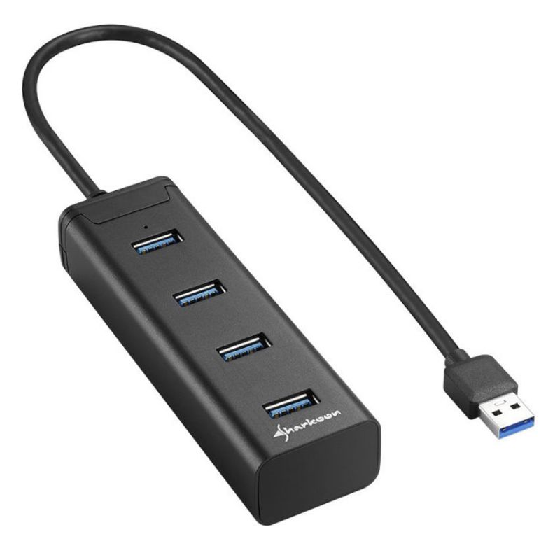 Descripción Sharkoon 4-Port USB 3.0. Interfaces de concentradores: USB 3.2 Gen 1 (3.1 Gen 1) Type-A. Velocidad de transferencia de datos: 5000 Mbit/s, Color del producto: Negro, Material de la carcasa: Aluminio. Alimentación: USB. Sistema operativo Windows soportado: Windows 7 Enterprise,Windows 7 Enterprise x64,Windows 7 Home Basic,Windows 7 Home Basic.... Ancho: 110 mm, Profundidad: 35 mm, Altura: 23 mm