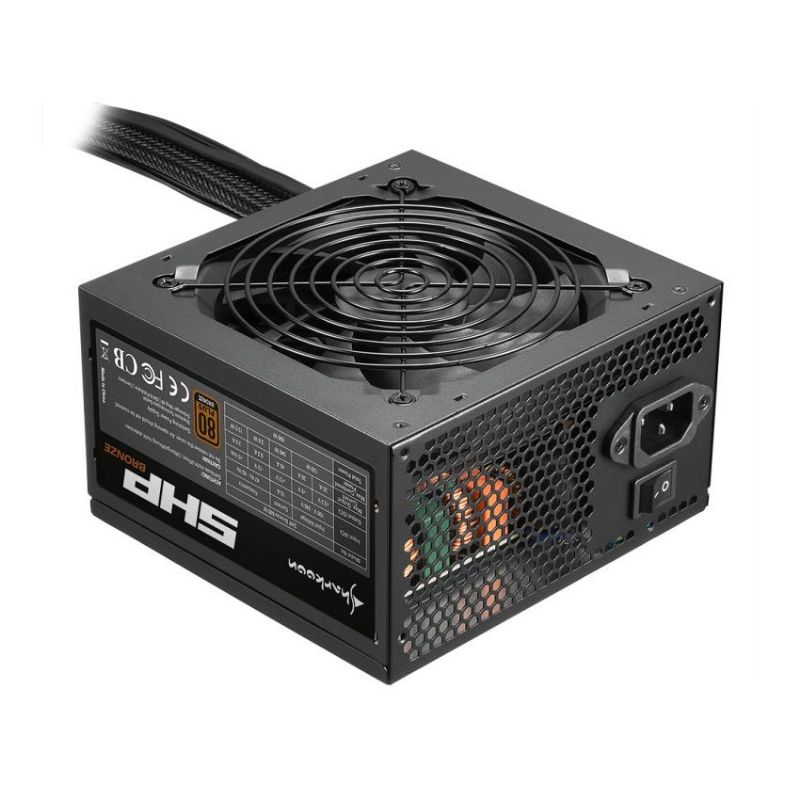 Descripción Sharkoon SHP Bronze. Potencia total: 500 W, Voltaje de entrada AC: 100 - 240 V, Frecuencia de entrada AC: 47 - 63 Hz. Alimentador de energía para tarjeta madre: 20+4 pin ATX, Longitud del cable de alimentación de la placa base: 55 cm, Longitud del cable de alimentación periférico (Molex): 150,550 mm. Utilizar con: PC, Factor de forma de fuente de alimentación (PSU): ATX, Certificación 80 PLUS: 80 PLUS Bronze. Color del producto: Negro, Tipo de enfriamiento: Activo, Diámetro de ventilador: 12 cm. Ancho: 150 mm, Profundidad: 140 mm, Altura: 86 mm