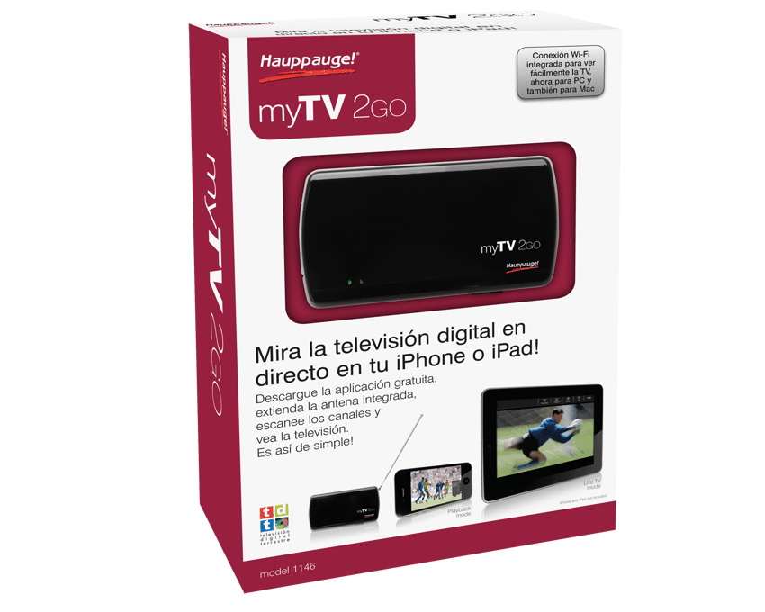 Hauppauge Sintonizador Mytv-2go Dvb-T Wireless Para Iphone/Mac (01146)Ver y grabar TV digital en sus dispositivos móviles, Mac o PC myTV 2GO es un portátil inalámbrico TDT DVB-T sintonizador de TV que transmite la televisión en vivo directamente en tu iPad, iPhone, iPod touch y Mac ri ng Requi sin cables o adaptadores. myTV 2 GO es de suscripción gratuita, y no utilizar su plan de datos móviles. Basta con encender el dispositivo myTV 2GO, extender la antena, conecte el dispositivo potable a la myTV 2GOWi-Fi de la red, descargue el r F ee AP que pfromt e tor s aplicación y comenzar a ver y grabar TV de alta calidad digital desde cualquier lugar con un DVB-T (TDT) de recepción.Completamente inalámbrico myTV 2GO está diseñado para uso móvil. Que las corrientes de televisión en directo a su iPad, iPhone, iPod touch, Mac y PC a través de Wi-Fi.Poderoso myTV 2GO utiliza la última º e el estado de la tecnología más avanzada de chips para lograr que los cambios rápidos de canales, imágenes nítidas, y la recepción de alta calidad incluso en lugares remotos.Versátil Con la aplicación gratuita myTV 2GO, puede ver y grabar tus programas favoritos de TV