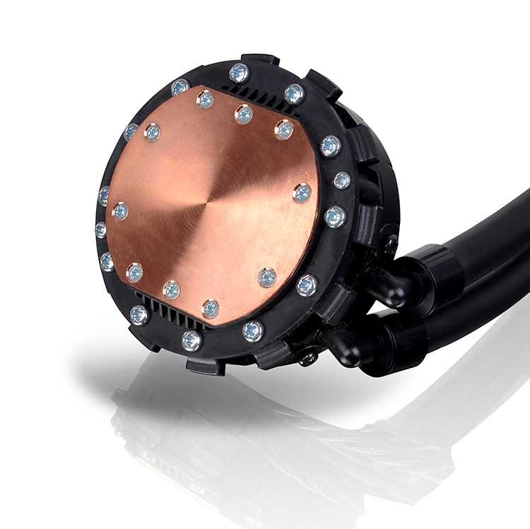 Sistema de refrigeración líquida con bloque para CPU de cobre, potente bomba, radiador de aluminio de gran superficie y líquido refrigerante ya integrado con sistema de circulación cerrado para evitar fugas.