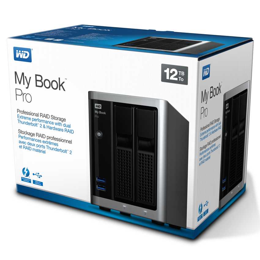 Descripción Western Digital My Book Pro 12TB. Capacidad de disco duro: 12000 GB, Tamaño de disco duro: 3.5", Velocidad de rotación de disco duro: 7200 RPM. Tecnología de conectividad: Alámbrico, Versión USB: 3.0 (3.1 Gen 1), Velocidad de transferencia de datos: 435 Mbit/s. Color del producto: Gris, Negro. Ancho: 10,9 cm, Profundidad: 21,6 cm, Altura: 14,8 cm. Cables incluidos: Thunderbolt, USB