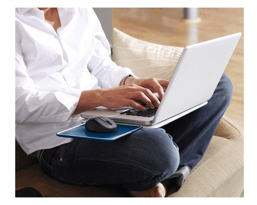 Un soporte para las rodillas elegante y ligero, con alfombrilla retráctil, que permite usar el portátil y su ratón cómodamente en cualquier sitio.