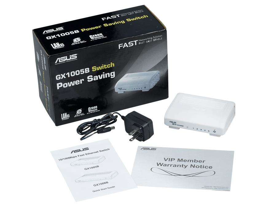 Asus GX1005B, 0.1 Gbit/s, 10/100 Mb/s, Fast Ethernet, No administrado, 10BASE-T, 100BASE-TX, 35 x 91 x 36 mm Asus GX1005B. Transmisión de datos: 0.1 Gbit/s, 10/100 Mb/s. Red: Fast Ethernet. Características de manejo: No administrado. Conectividad: 10BASE-T, 100BASE-TX. Peso y dimensiones: 35 x 91 x 36 mm, 164 g. Contro de energía: AC 120V, 60Hz. Aprobaciones reguladoras: UL1950, TUV, FCC Part 15 Class B CE Mark VCCI C-Tick MIC CCC. Condiciones ambientales: 10 - 90 %, 0 - 40 °C, -20 - 70 °C, 32 - 104 °F. Color: Blanco